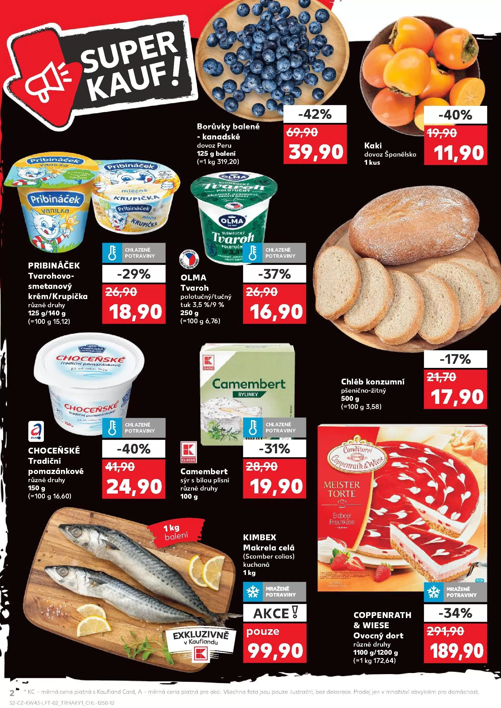 Pro milovníky sýrů je v nabídce Choceňský camembert s bylinkami za 24,90 Kč a tradiční pomazánkové sýry různých druhů za 16,90 Kč. Nezapomeňte také na mraženou makrelu Kimbex za 19,90 Kč a ovocný dort Coppenrath & Wiese, který je nyní za 189,90 Kč.
