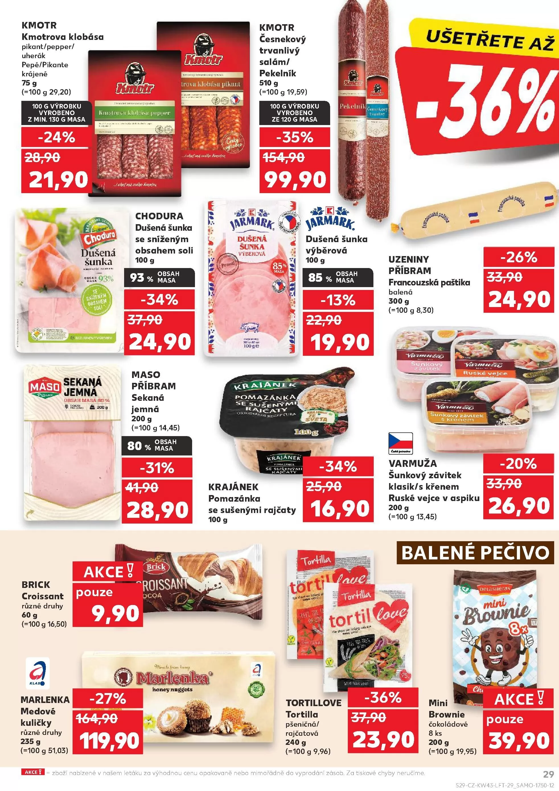 V letáku obchodu Kaufland najdete širokou nabídku kvalitních uzenin a delikates. Mezi nimi se objevují oblíbené produkty jako kmotrova klobása, uherák a česnekový salám, které jsou vyrobeny z minimálně 120 g masa. Na své si přijdou i milovníci jemné sekané a dušené šunky, které obsahují až 93 % masa.