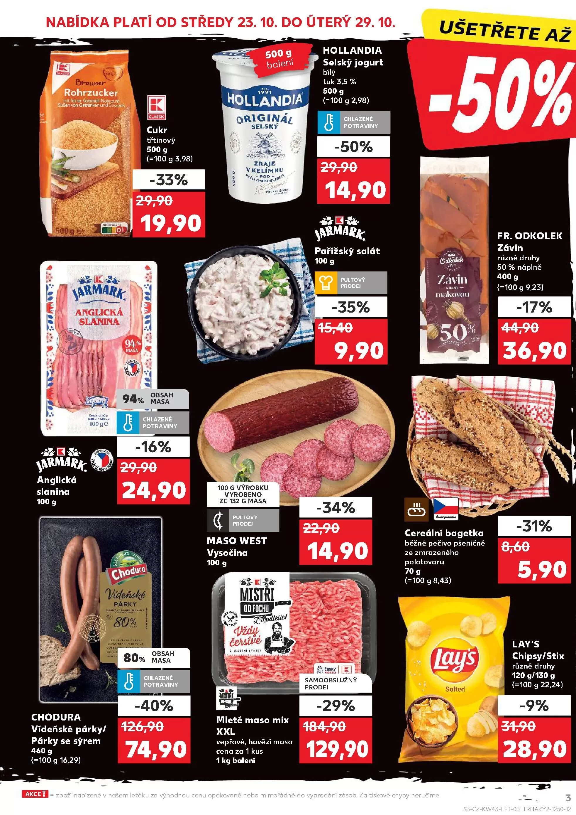 V letáku obchodu Kaufland najdete širokou nabídku produktů, které potěší vaše chuťové pohárky a zároveň ušetří vaši peněženku. Od středy 23.10. do úterý 29.10. můžete využít akční ceny na různé potraviny.