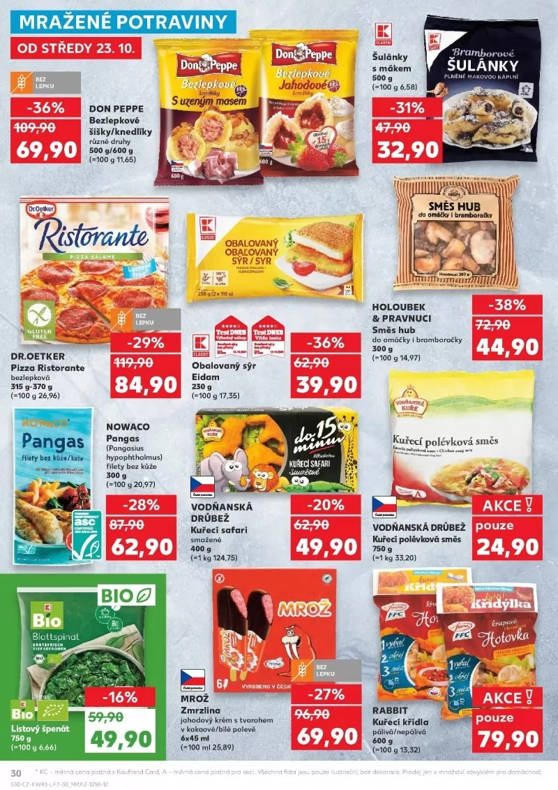 V letáku obchodu Kaufland najdete širokou nabídku mražených potravin, které potěší každého milovníka dobrého jídla. Od středy 23.10. si můžete zakoupit šulánky s mákem za skvělou cenu 69,90 Kč (původní cena 100 g 6,58 Kč, sleva -31%). Dále nabízíme obalovaný sýr Eidam, který je nyní za 44,90 Kč (původní cena 100 g 17,35 Kč, sleva -38%).