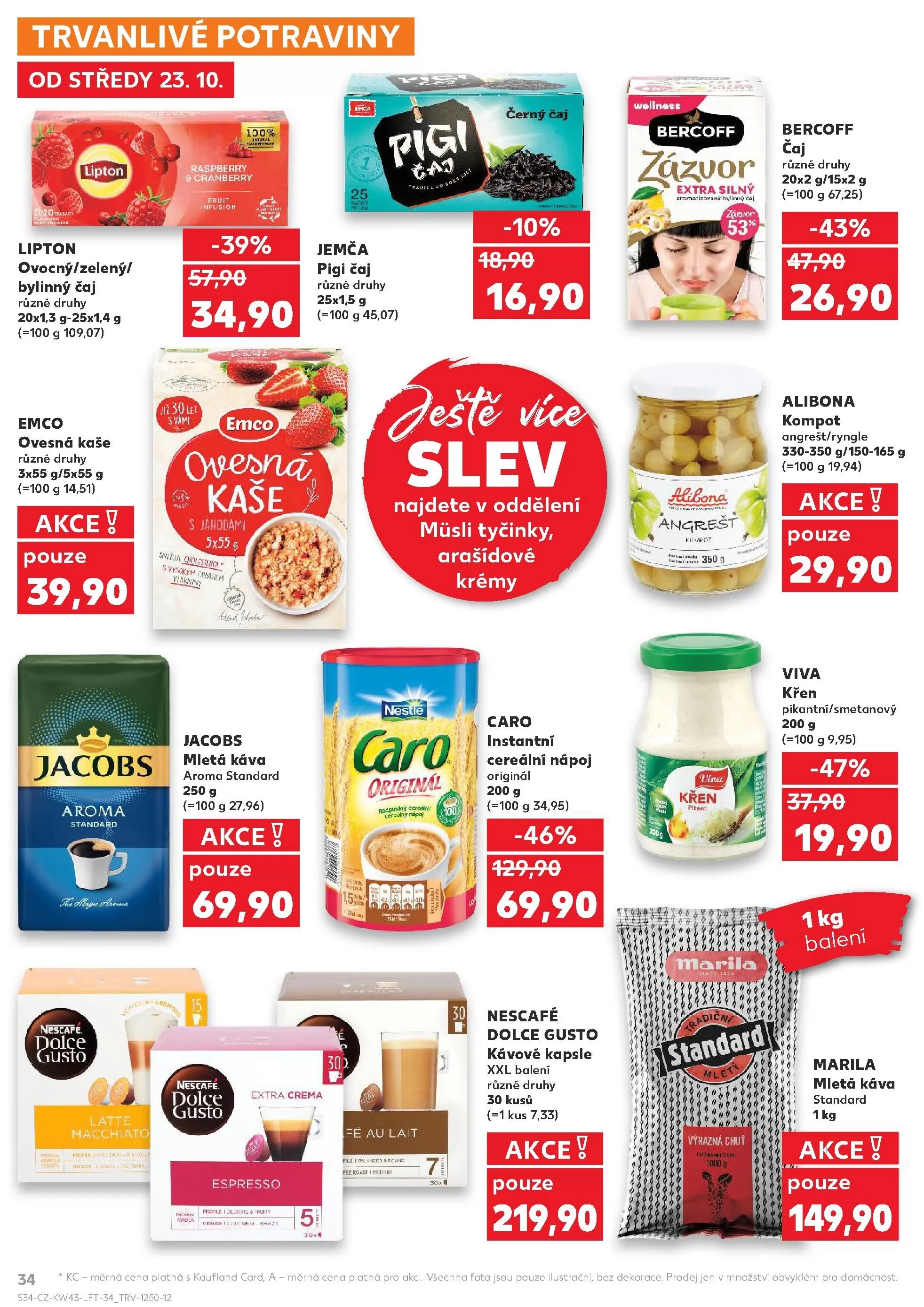 V letáku obchodu Kaufland najdete širokou nabídku trvanlivých potravin, které potěší každého. Od středy 23. 10. si můžete zakoupit ovocné, zelené a bylinné čaje Lipton v různých druzích. Ovesné kaše Emco jsou také v akci, ideální pro zdravou snídani.