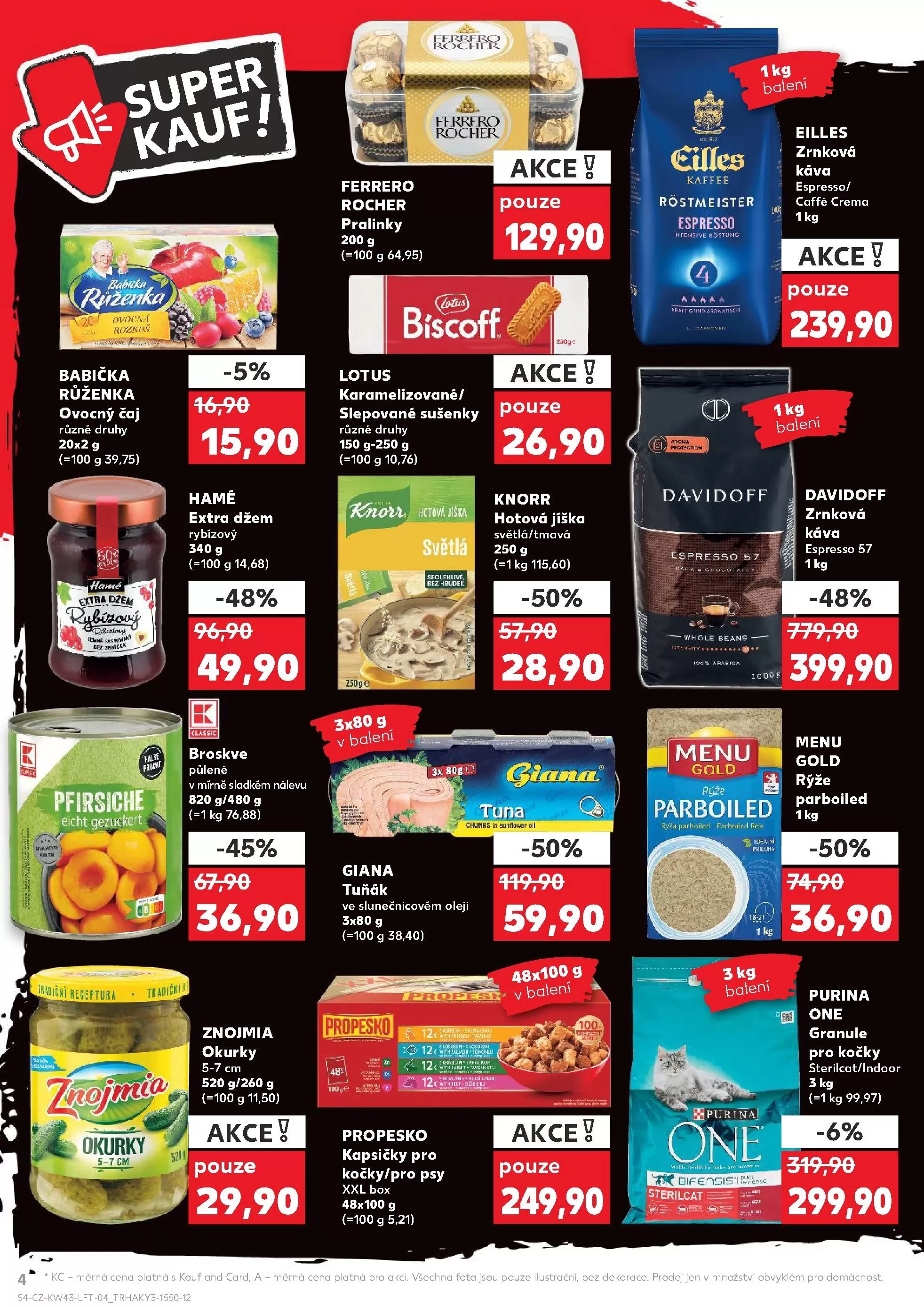V letáku obchodu Kaufland najdete širokou nabídku produktů za akční ceny. Mezi nimi se objevují oblíbené pralinky Ferrero Rocher o hmotnosti 200 g za 129,90 Kč. Milovníci kávy ocení zrnkovou kávu Eilles espresso za 239,90 Kč za kilogram. Pro příznivce čajů je připraven ovocný čaj Babička Růženka v různých druzích, balení 20x2 g za 39,75 Kč.