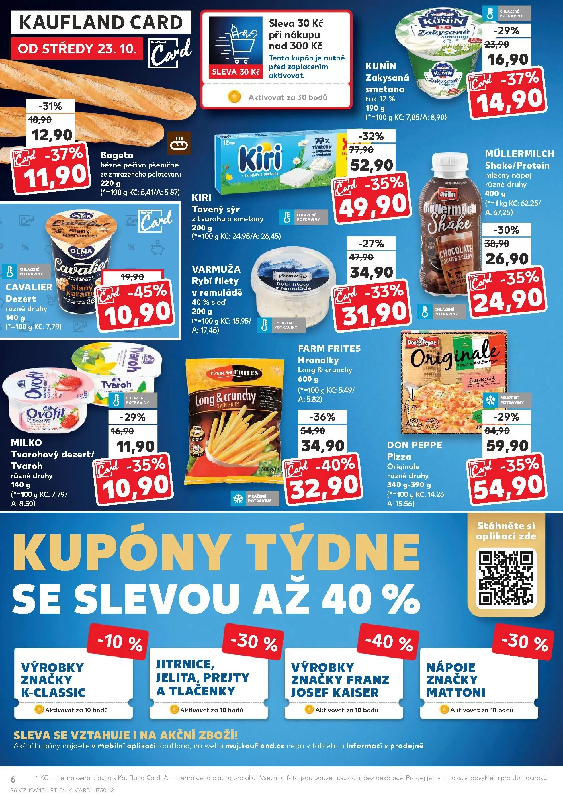 V letáku obchodu Kaufland od středy 23. 10. najdete skvělé nabídky a slevy. Při nákupu můžete využít kupón na slevu 30 Kč, který je nutné aktivovat před zaplacením. Mezi produkty, které si můžete pořídit, patří zakysaná smetana Kunin (190 g) za 11,90 Kč, tavený sýr Kiri (220 g) za 10,90 Kč a chlazené potraviny Müller (200 g) za 34,90 Kč.