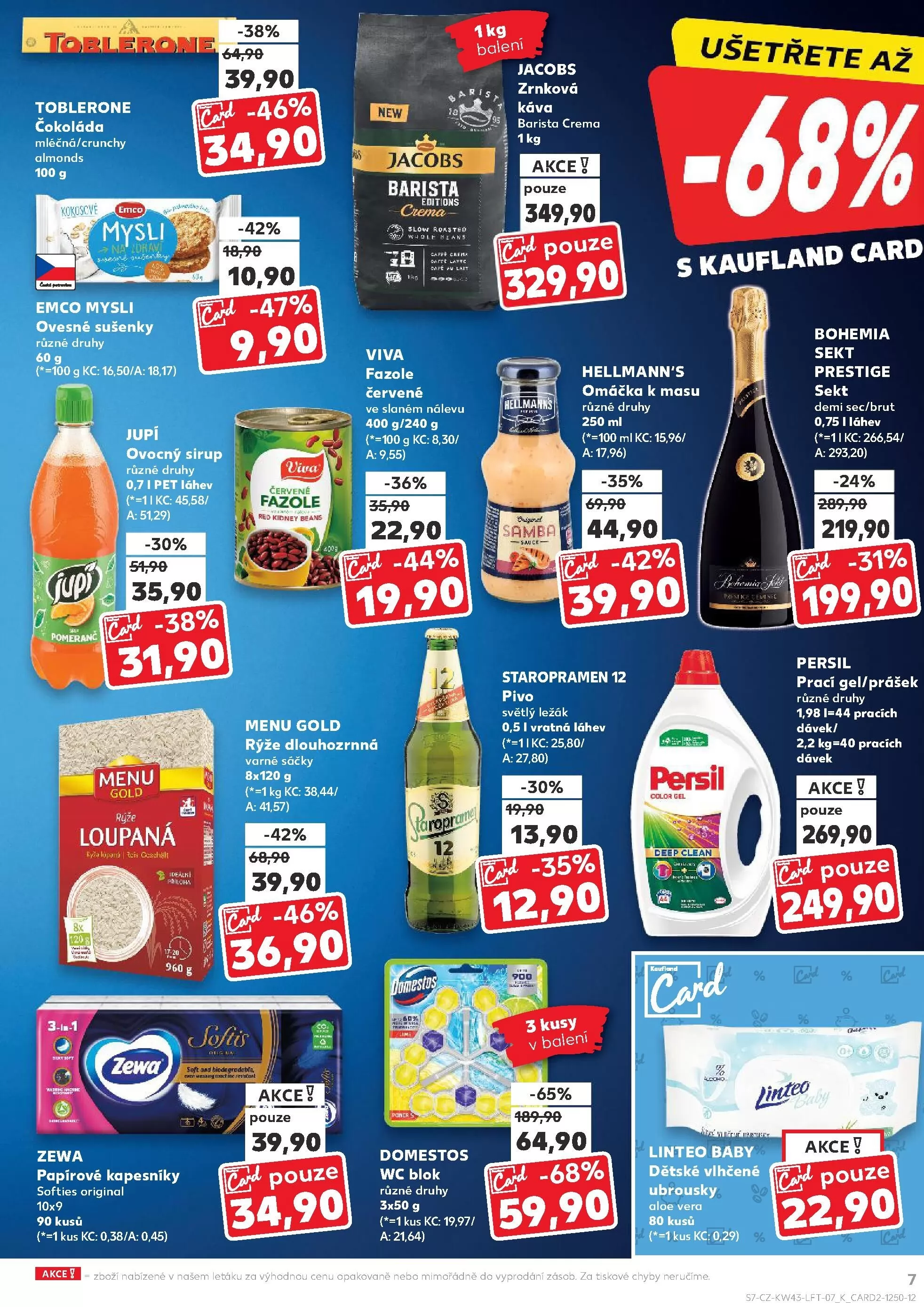 V letáku obchodu Kaufland najdete širokou nabídku produktů za výhodné ceny. Mezi nimi se objevují 1 kg balení čokolády Toblerone v mléčné a crunchy variantě, které jsou nyní za akční cenu 39,90 Kč. Dále si můžete vybrat z různých druhů ovesných sušenek Emco mysli za 10,90 Kč.