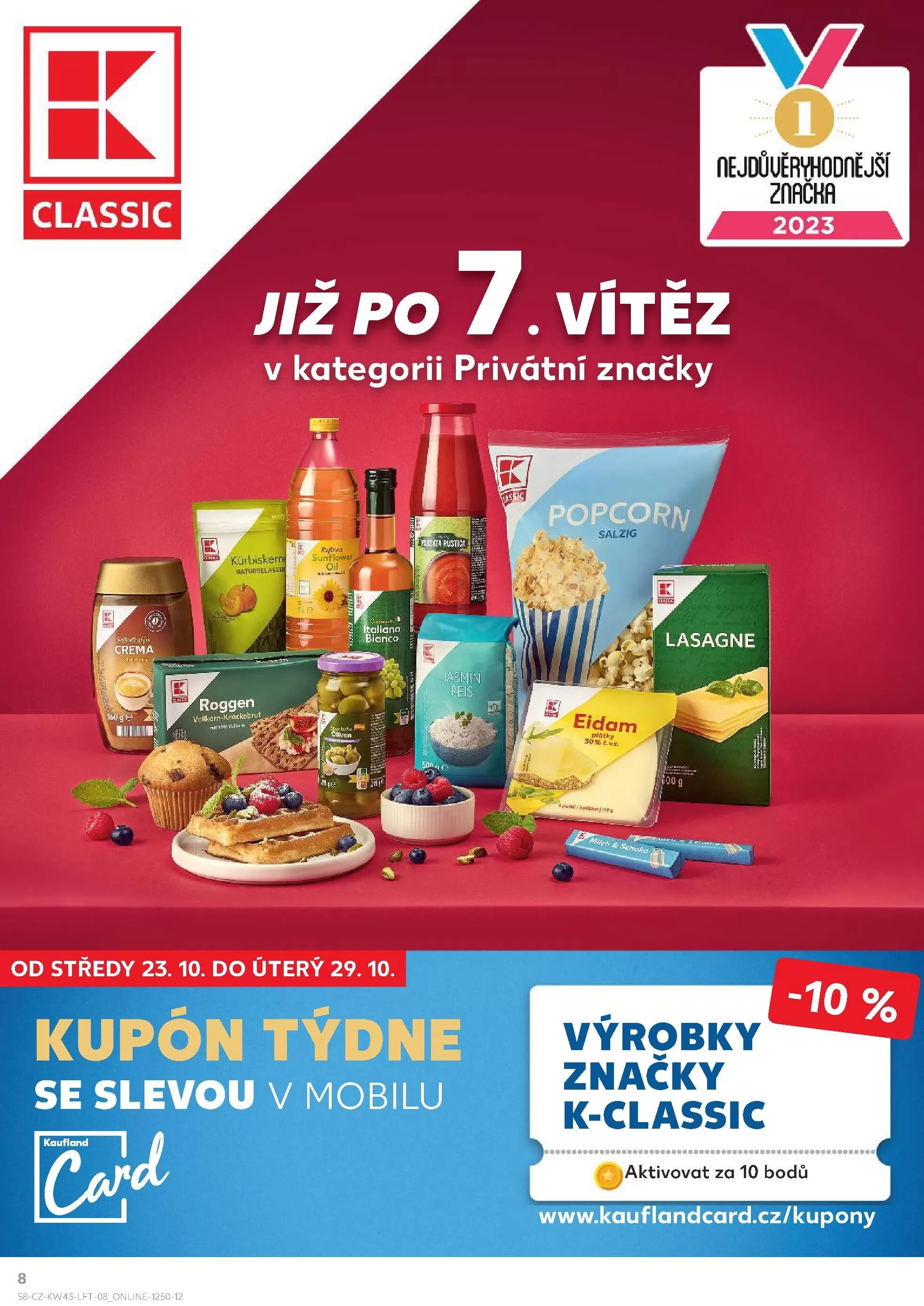 V letáku obchodu Kaufland najdete širokou nabídku produktů, které potěší každého zákazníka. Od středy 23. 10. do úterý 29. 10. můžete využít speciální akce a slevy na vybrané výrobky. Mezi nimi se objevují lahodné popcorny, chutné lasagne a kvalitní eidam. Nezapomeňte také na produkty značky K-Classic, které se pyšní oceněním v kategorii privátních značek. Aktivujte si kupón týdne za 10 bodů a získejte slevu v mobilu. Navštivte www.kauflandcard.cz/kupony pro více informací.
