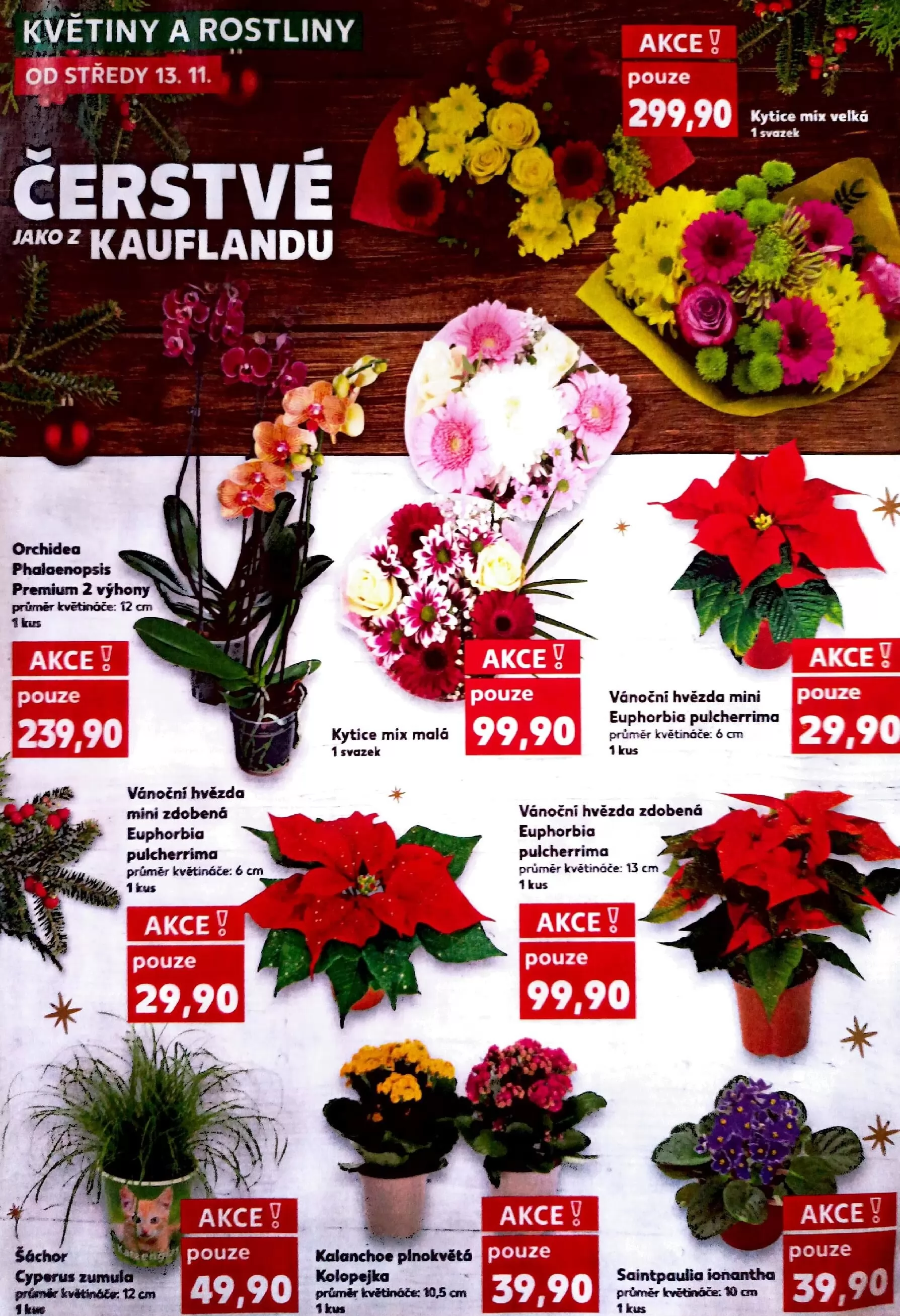 V letáku obchodu Kaufland najdete širokou nabídku čerstvých rostlin a květin. Od středy 13.11. si můžete pořídit kytici mix velkou za akční cenu 0 Kč. Dále nabízíme vánoční hvězdu mini s dvěma výhony za 239,90 Kč a mini zdobenou vánoční hvězdu za 29,90 Kč. Pro milovníky menších rostlin je k dispozici kytice mix malá a kalanchoe plnokvětá za 99,90 Kč. Nezapomeňte také na vánoční hvězdu zdobenou s průměrem květináče 13 cm za 99,90 Kč. Dalšími zajímavými produkty jsou cypřiš zumuta za 49,90 Kč a saintpaulia ionantha za 29,90 Kč. Navštivte Kaufland a objevte krásu rostlin!