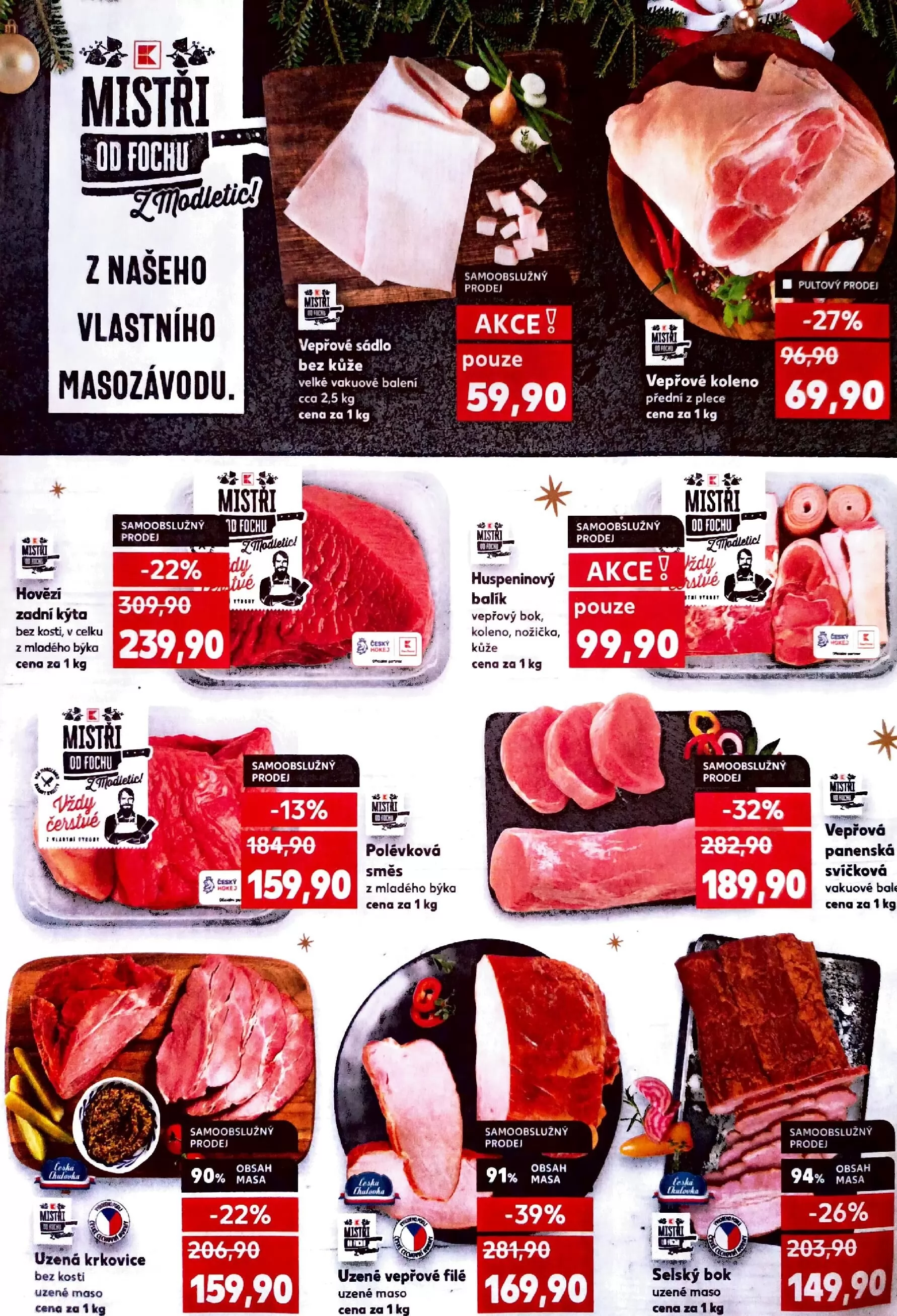 V letáku obchodu Kaufland najdete širokou nabídku kvalitních masných výrobků. Mezi hlavními produkty se objevuje vepřové sádlo bez kůže v praktickém vakuovém balení o hmotnosti cca 2,5 kg. Dále nabízíme hovězí zadní kýtu bez kosti za skvělou cenu 239,90 Kč/kg.