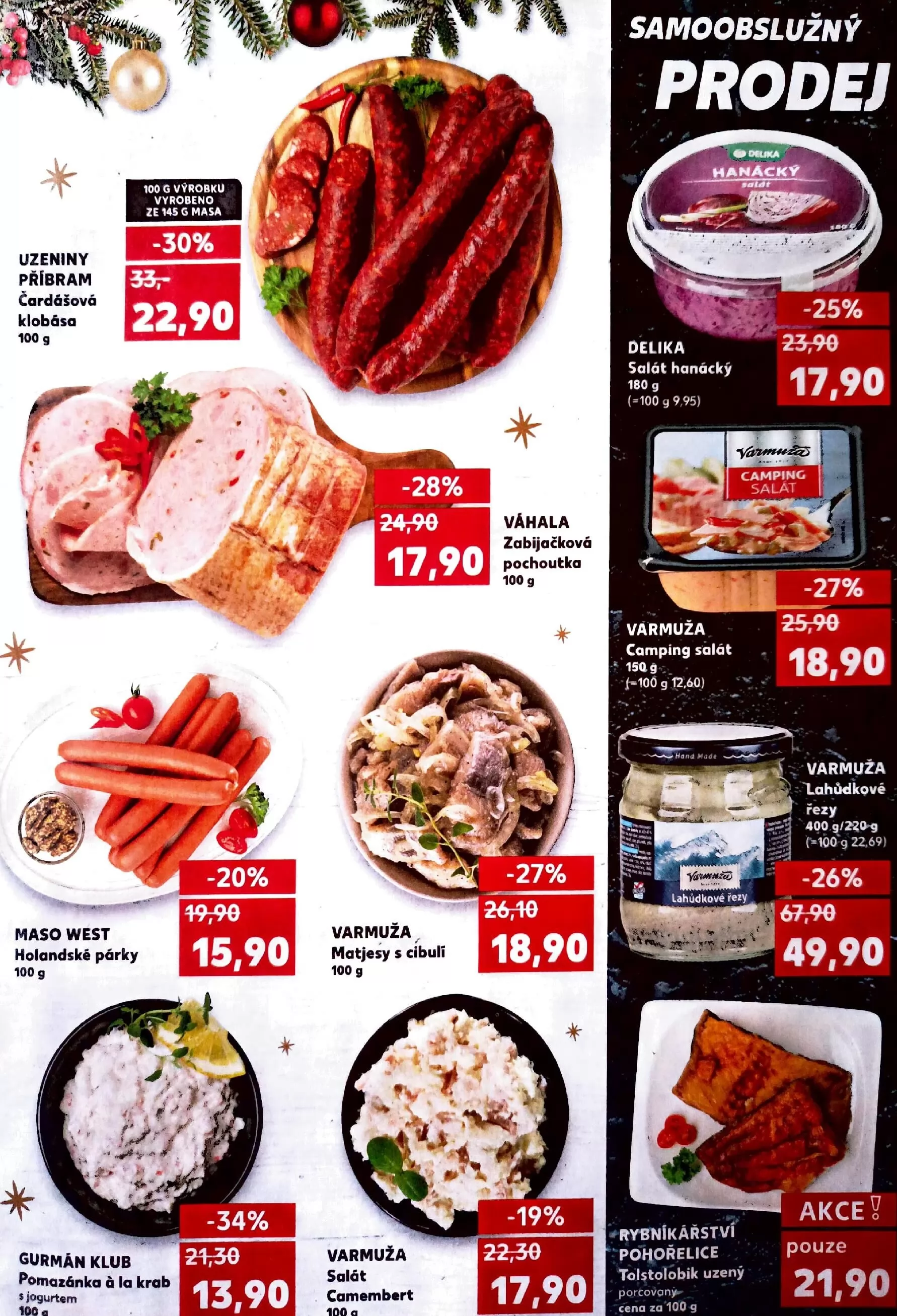 V letáku obchodu Kaufland najdete širokou nabídku kvalitních produktů. Mezi nimi se objevují lahodné hanácké uzeniny, jako je čardášová klobása za 22,90 Kč za 100 g. Pro milovníky salátů je k dispozici hanácký salát o hmotnosti 180 g za 17,90 Kč, který je nyní se slevou 25%.