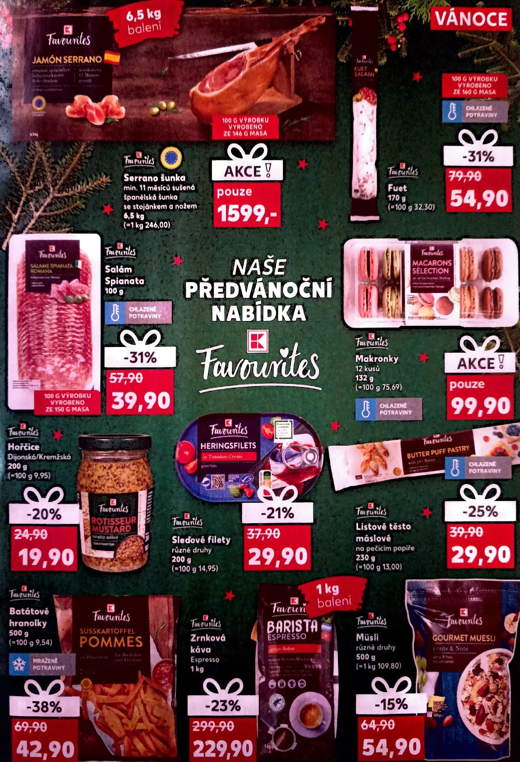 V letáku obchodu Kaufland najdete širokou nabídku potravin, které potěší každého. Mezi lákavé produkty patří španělská serrano šunka, balení 6,5 kg, nyní za akční cenu 1599,- Kč. Dále si můžete vychutnat fuet, 170 g za 54,90 Kč, nebo salám spianata, 100 g za 39,90 Kč.