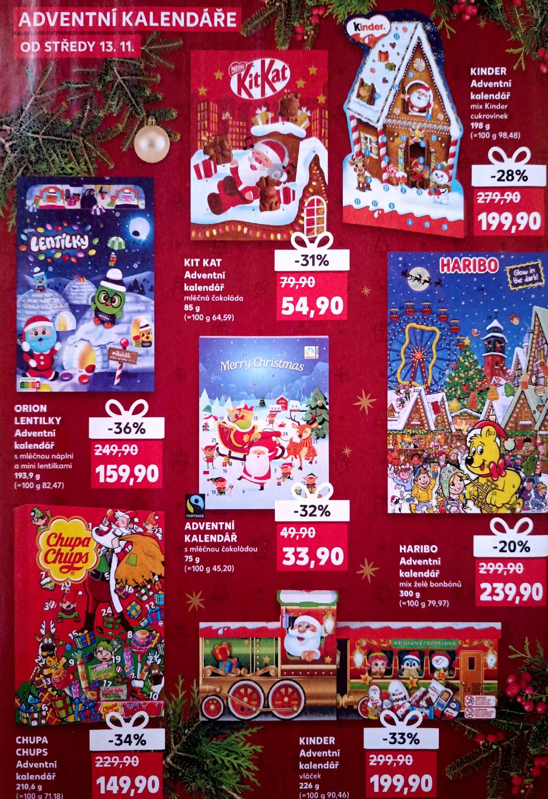 V letáku obchodu Kaufland najdete širokou nabídku adventních kalendářů, které potěší každého milovníka sladkostí. Od středy 13.11. si můžete vybrat z různých variant, jako je Kit Kat s mléčnou čokoládou (85 g) za skvělou cenu 64,59 Kč. Dále je k dispozici Kinder adventní kalendář s mixem kinder cukrovinek, který je nyní za 199,90 Kč se slevou 28%.