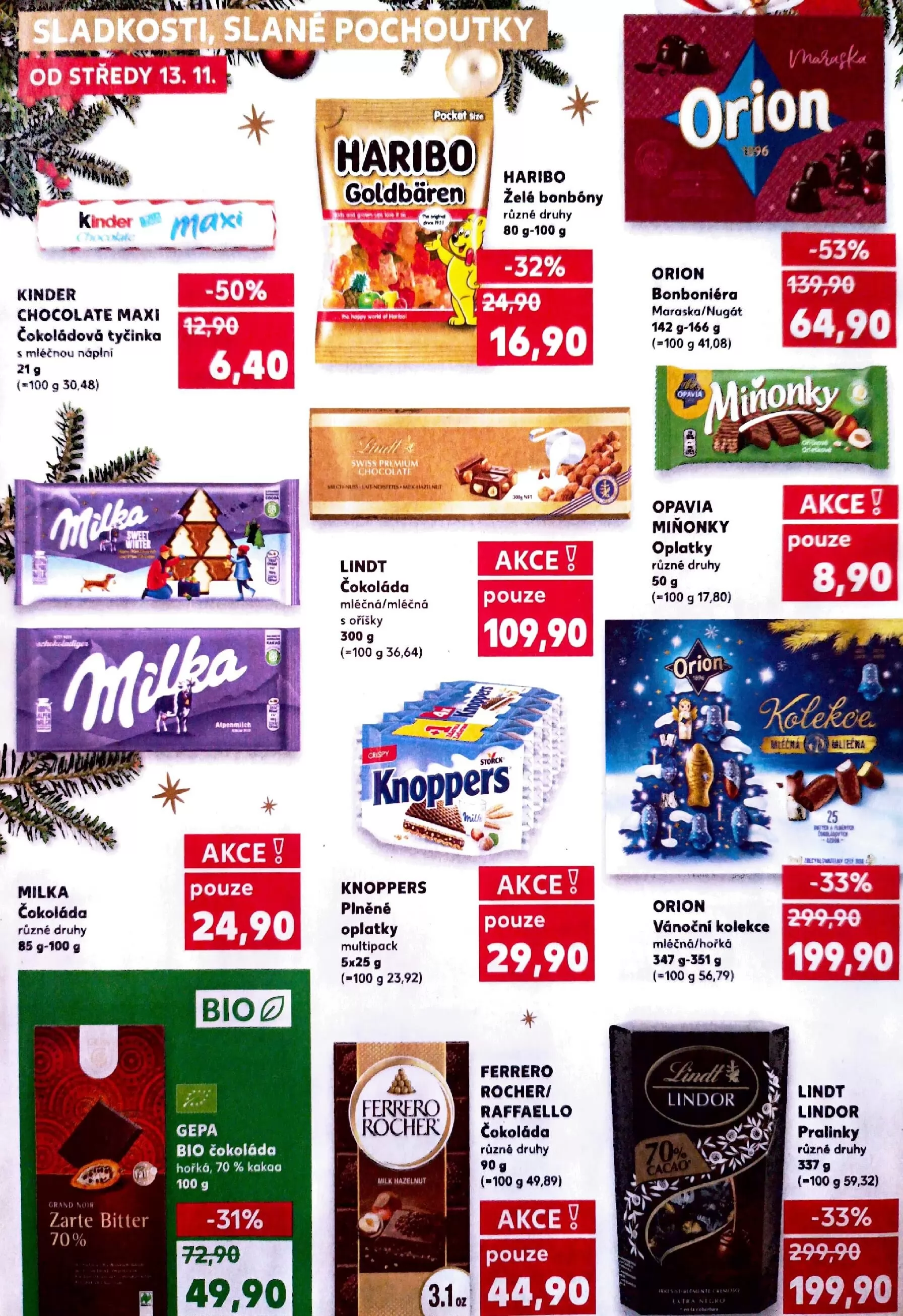 V letáku obchodu Kaufland najdete širokou nabídku sladkostí a čokoládových produktů. Od středy 13.11. si můžete vychutnat čokoládové tyčinky Kinder Chocolate Maxi s mléčnou náplní za skvělou cenu 30,48 Kč/100 g. Milka čokoláda v různých druzích je také v akci, cena začíná na 85 Kč/100 g.