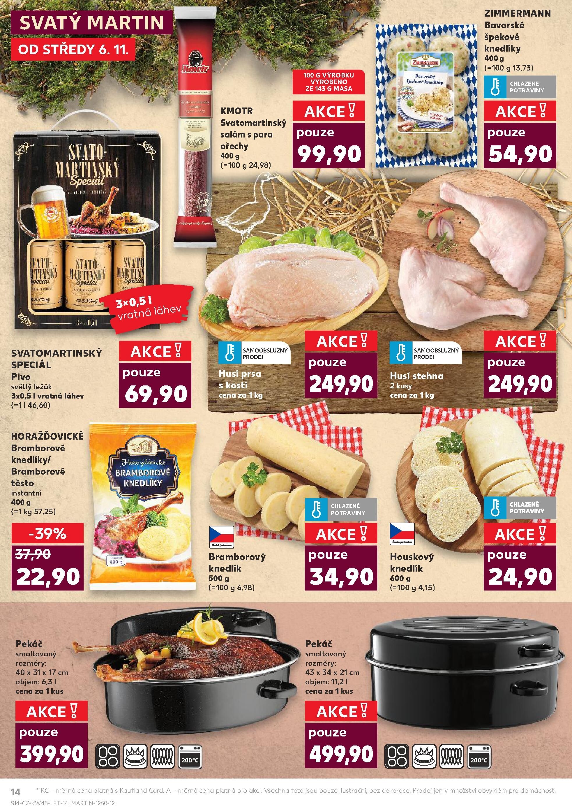 V letáku obchodu Kaufland najdete skvělé akce na svatomartinské produkty! Od středy 6.1. si můžete pořídit husi prsa s kostí za akční cenu 99,90 Kč. Nezapomeňte také na bramborové knedlíky, které jsou nyní za 22,90 Kč.