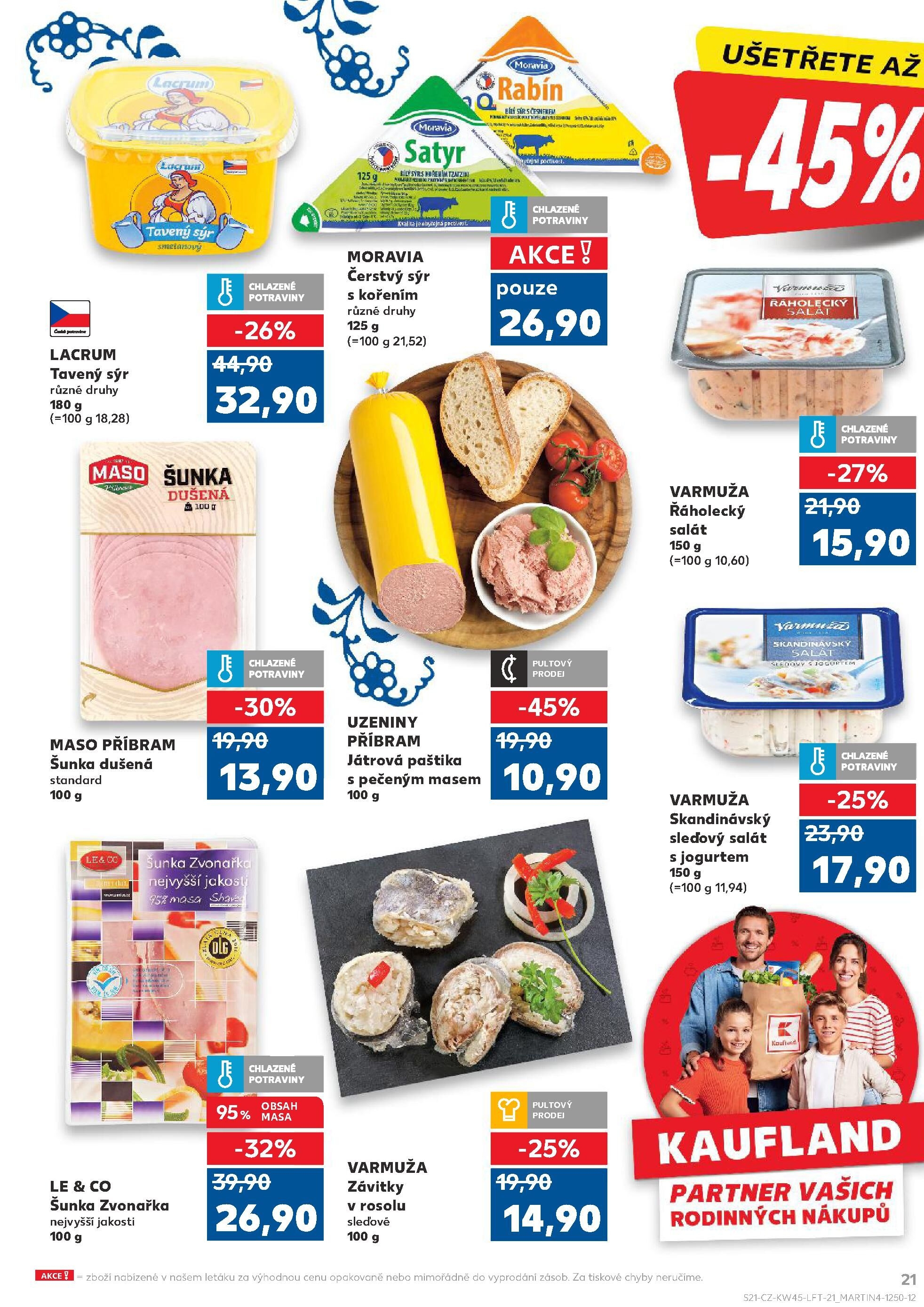 V letáku obchodu Kaufland najdete širokou nabídku chlazených potravin za výhodné ceny. Mezi produkty se objevují tavené sýry různých druhů, které jsou nyní v akci za 32,90 Kč. Dále si můžete vybrat čerstvý sýr s kořením za 26,90 Kč nebo šunku dušenou od značky Řáholecký za 13,90 Kč, což představuje slevu 30%.