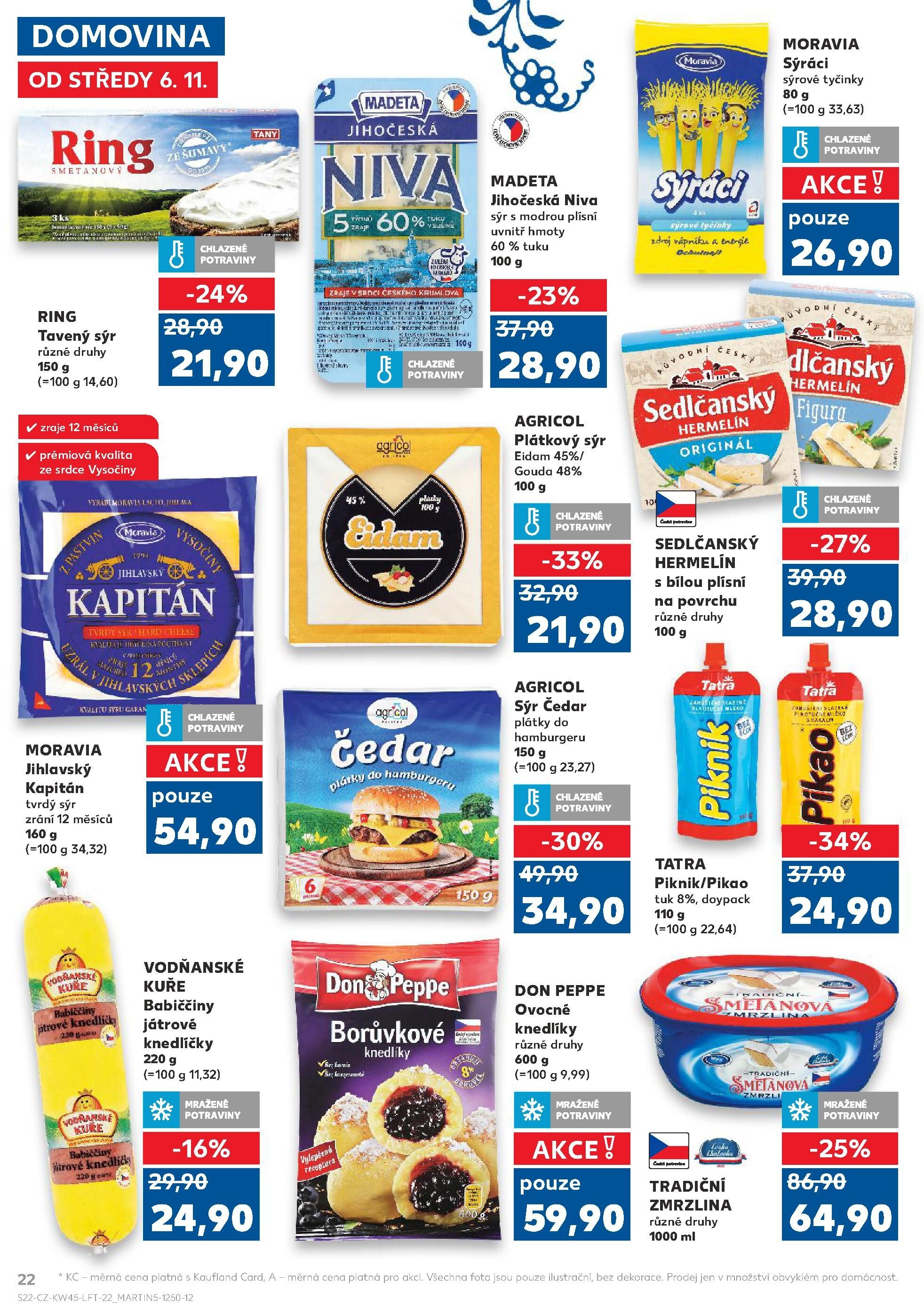 V letáku obchodu Kaufland najdete širokou nabídku kvalitních potravin. Od středy 6. 11. si můžete zakoupit například sýrové tyčinky Moravia, tavený sýr různých druhů, nebo jihočeskou nivu s modrou plísní. V akci je také tvrdý sýr Jihlavský kapitán, který zraje 12 měsíců.
