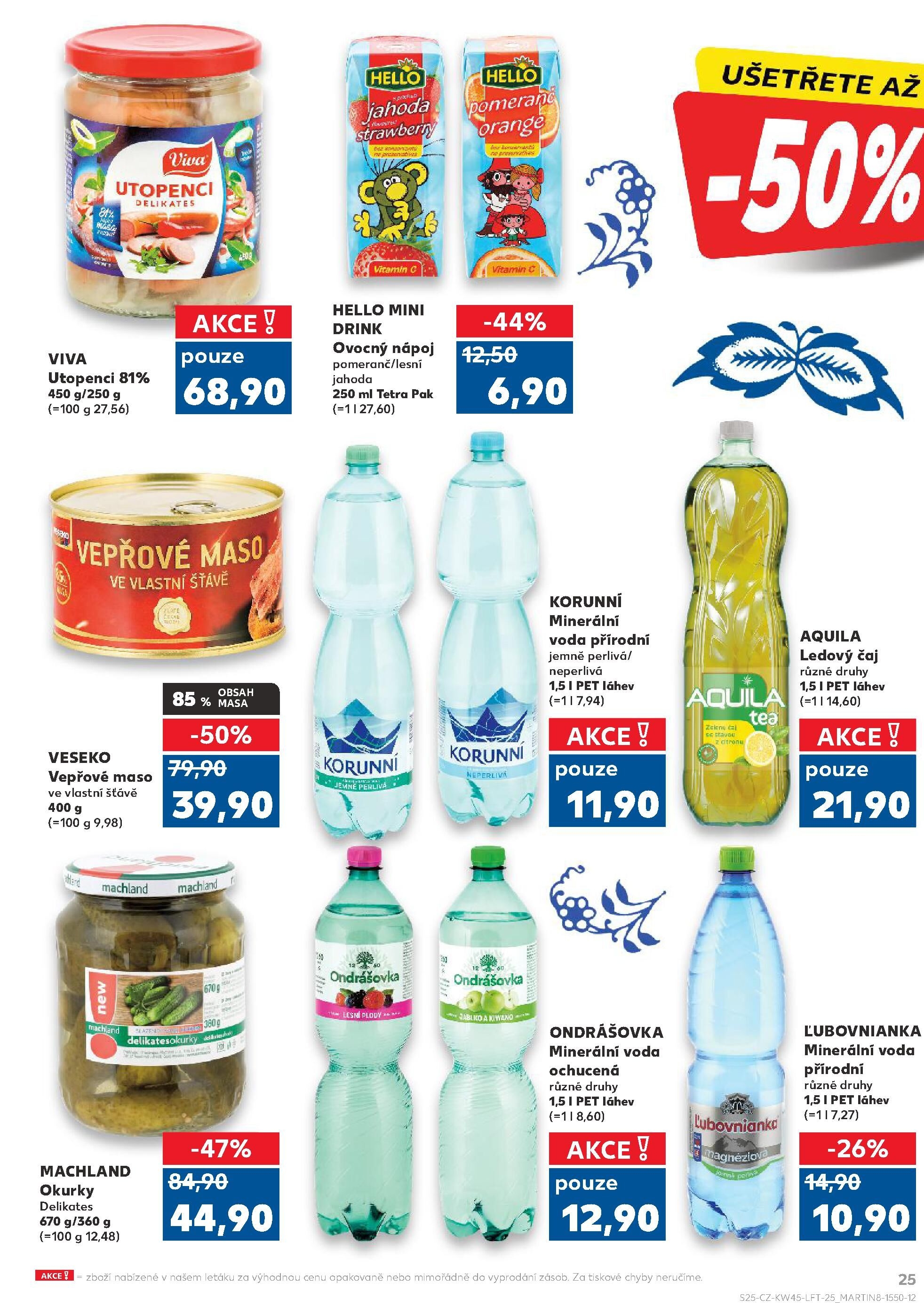 V letáku obchodu Kaufland najdete skvělé akční nabídky! Ušetřete až 81% na delikatesních utopencích, které nyní pořídíte za pouhých 68,90 Kč. Nezapomeňte také na ovocný nápoj Hello mini drink v příchutích pomeranč a lesní jahoda, který je k dostání za 27,60 Kč.