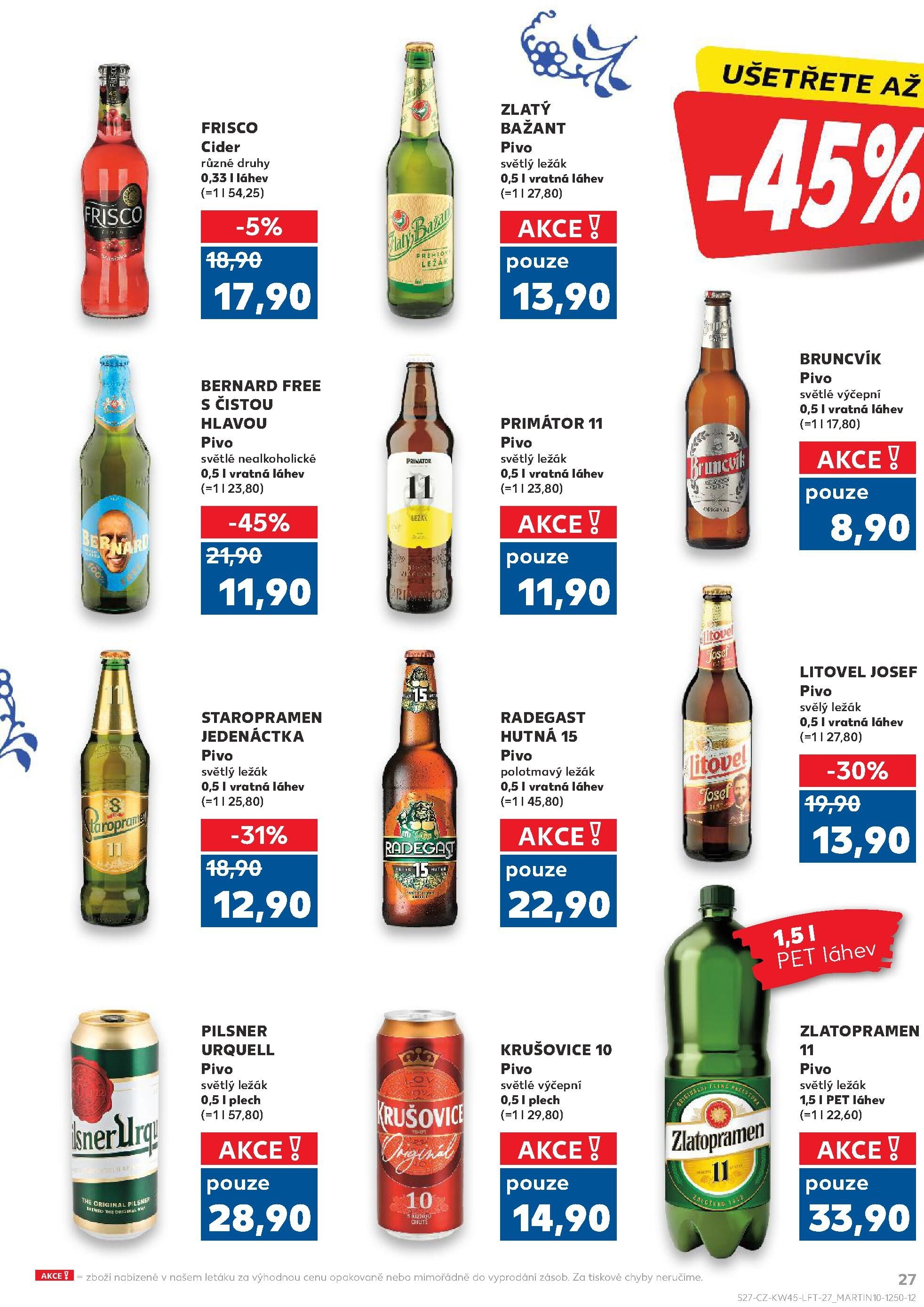 V letáku obchodu Kaufland najdete širokou nabídku nápojů za skvělé ceny. Ušetřete s Frisco ciderem, který je k dostání za 17,90 Kč za 0,33 l láhev. Nezapomeňte také na Bernard Free, světlé nealkoholické pivo, nyní za 11,90 Kč za 0,5 l vratnou láhev.