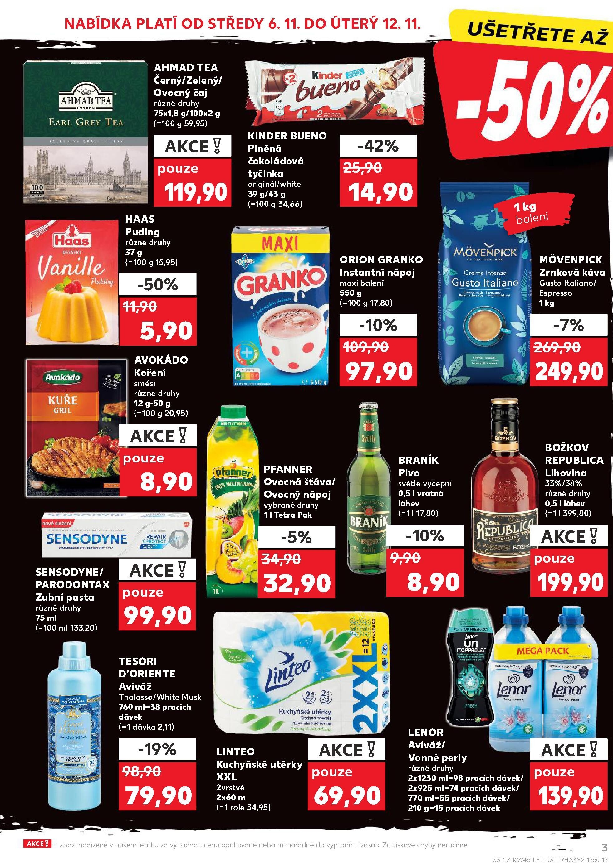 V letáku obchodu Kaufland, platném od středy 6. 11. do úterý 12. 11., najdete širokou nabídku produktů za výhodné ceny. Mezi nimi se objevují čaje Ahmad Tea, včetně oblíbeného Earl Grey, a různé druhy černého, zeleného a ovocného čaje. Dále si můžete zakoupit avokádo, grilované kuře a puding Haas v různých příchutích.
