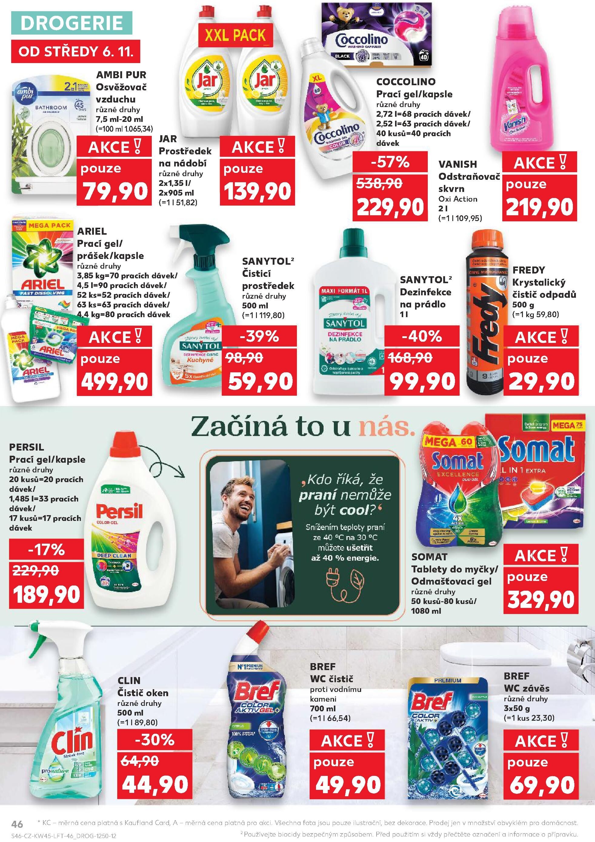 V letáku obchodu Kaufland od středy 6. 11. najdete širokou nabídku drogerie za akční ceny. Osvěžovač vzduchu Ambi Pur v různých druzích je nyní za 79,90 Kč. Jar prostředek na nádobí, také v různých variantách, je k dostání za 139,90 Kč. Čisticí prostředek Sanytol je nyní za 59,90 Kč.