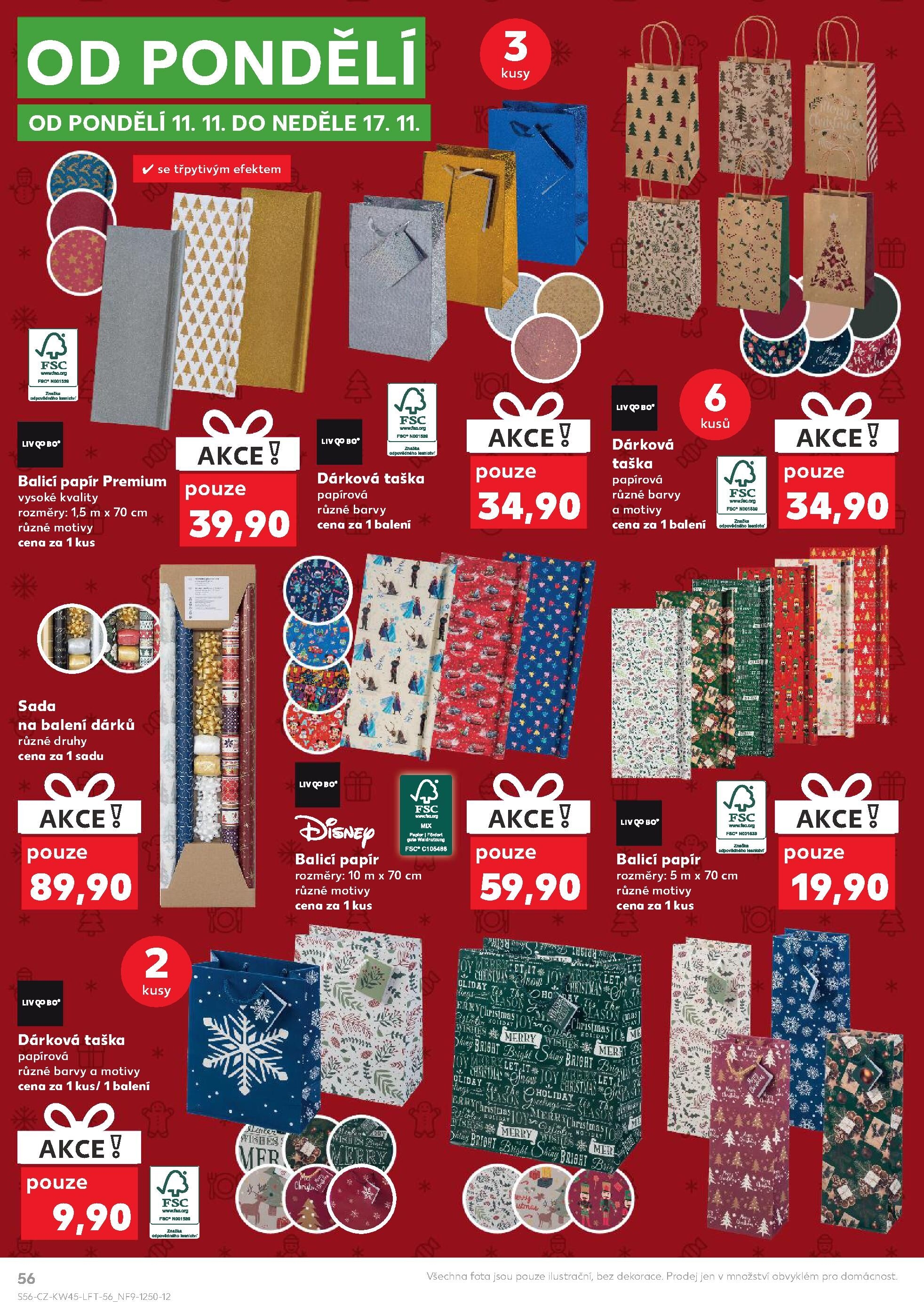 V letáku obchodu Kaufland najdete skvělé akce na produkty pro balení dárků. Od pondělí 11.11. do neděle 17.11. si můžete pořídit balicí papír premium v různých motivech za cenu pouze 89,90 Kč za kus. Dále nabízíme dárkové tašky za skvělou cenu 9,90 Kč za kus. Nezapomeňte také na balicí papír o rozměrech 10 m x 70 cm, který je k dispozici za 34,90 Kč. Využijte těchto výhodných nabídek a udělejte radost svým blízkým!