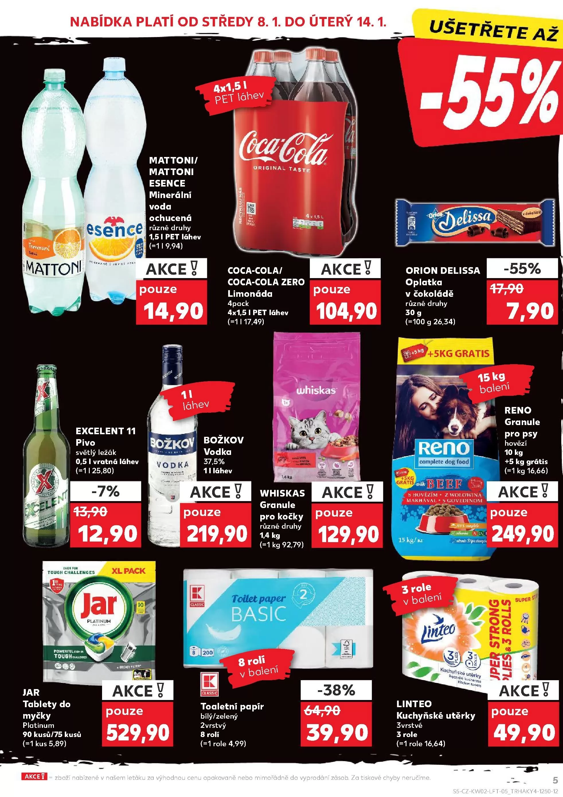 V letáku obchodu Kaufland najdete skvělou nabídku produktů, která platí od středy 8.1. do úterý 14.1. Mezi lákavými akcemi je minerální voda Mattoni v 1,5 l PET lahvi za 14,90 Kč. Dále si můžete pořídit Coca-Colu nebo Coca-Colu Zero v 4-packu (4x1,5 l) za 104,90 Kč.
