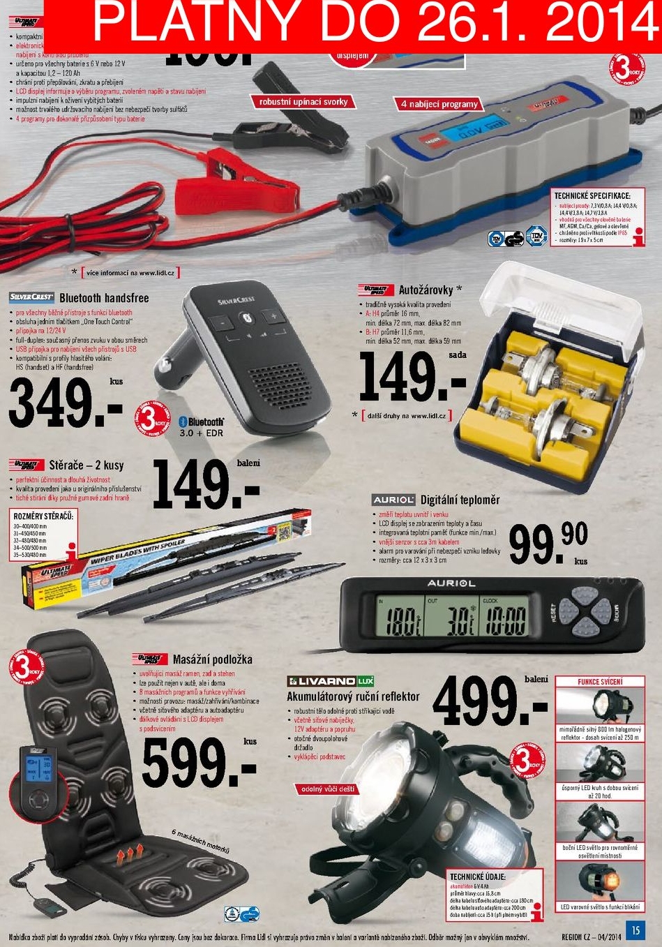 Lidl Nabíječka, handsfree, autožárovky, stěrače, digitální teploměr, vyhřívaný potah, ruční reflektor výprodej, akční leták