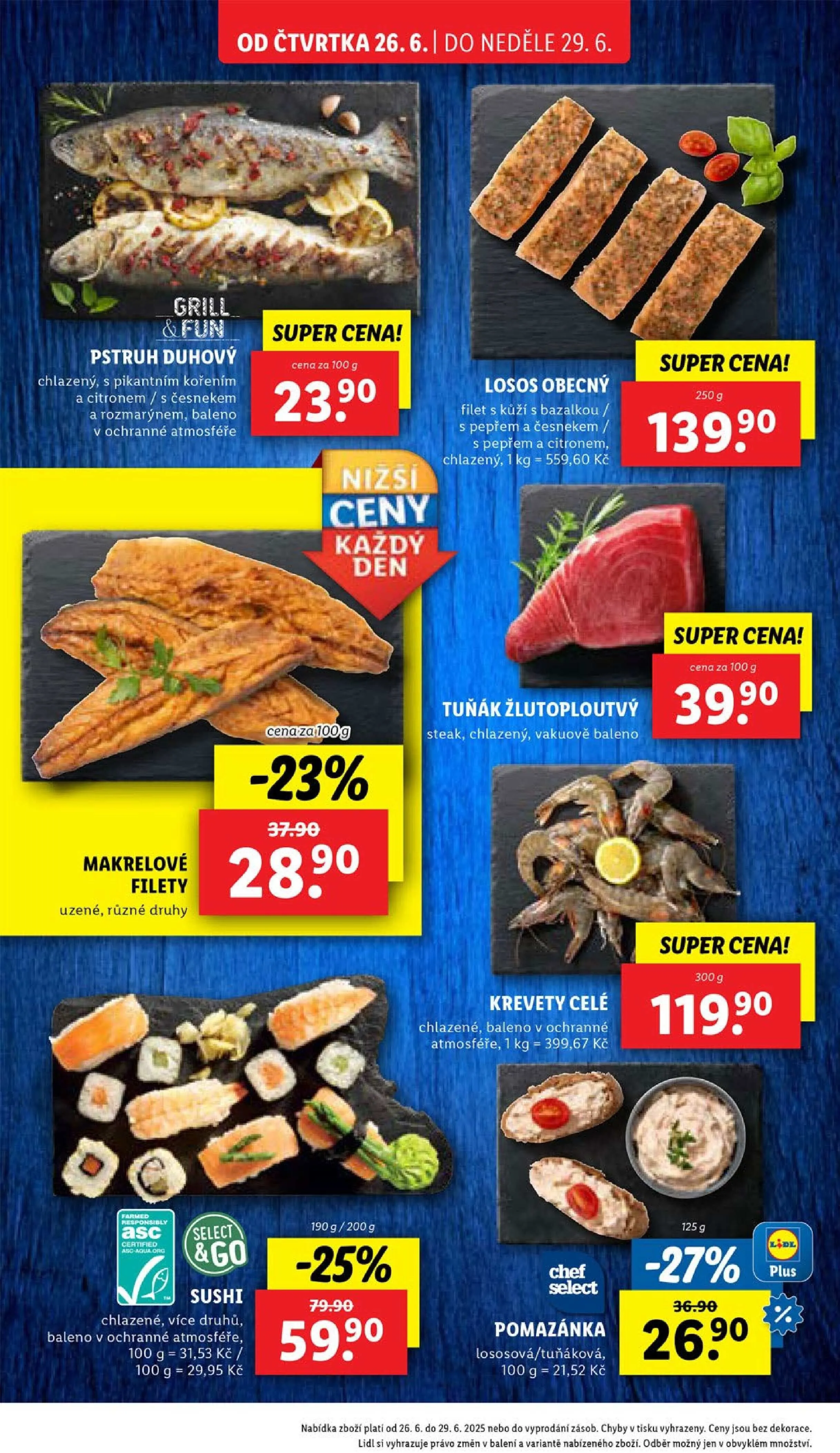 Také si můžete pochutnat na chlazeném tuňákovém steaku a celých krevetech, které jsou baleny v ochranné atmosféře. Pro milovníky sushi jsou připraveny různé druhy chlazeného sushi. Nezapomeňte také na lososovou a tuňákovou pomazánku. Všechny produkty jsou k dispozici za super ceny až do neděle 29.6. nebo do vyprodání zásob.