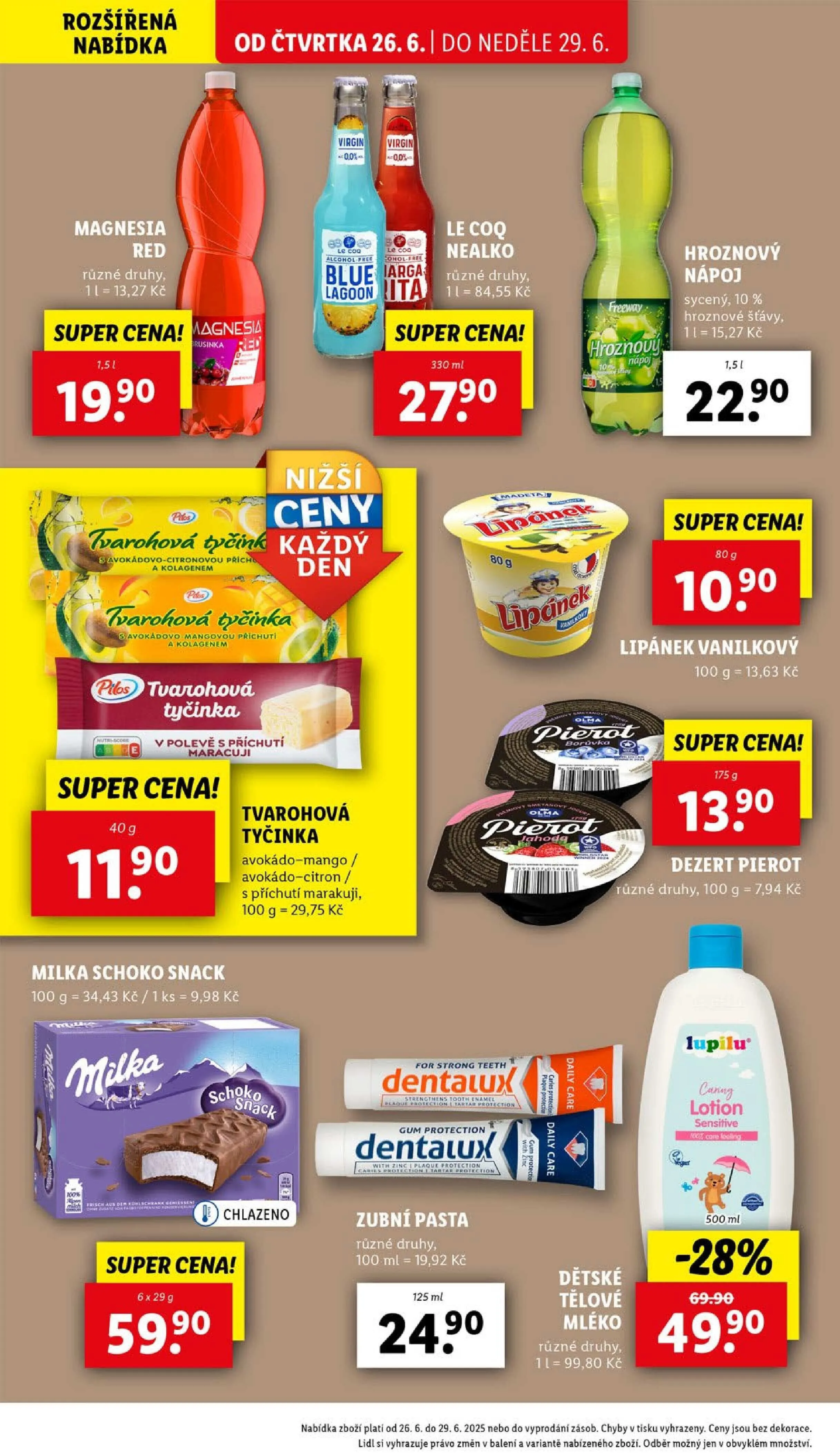 V letáku obchodu Lidl najdete rozšířenou nabídku produktů, které potěší každého zákazníka. Od čtvrtka 26. 6. do neděle 29. 6. si můžete pořídit různé druhy magnesia za super cenu od 1 do 13,27 Kč. Dále nabízíme nealkoholické nápoje Virgin v různých variantách za 11-84,55 Kč, ideální pro osvěžení.