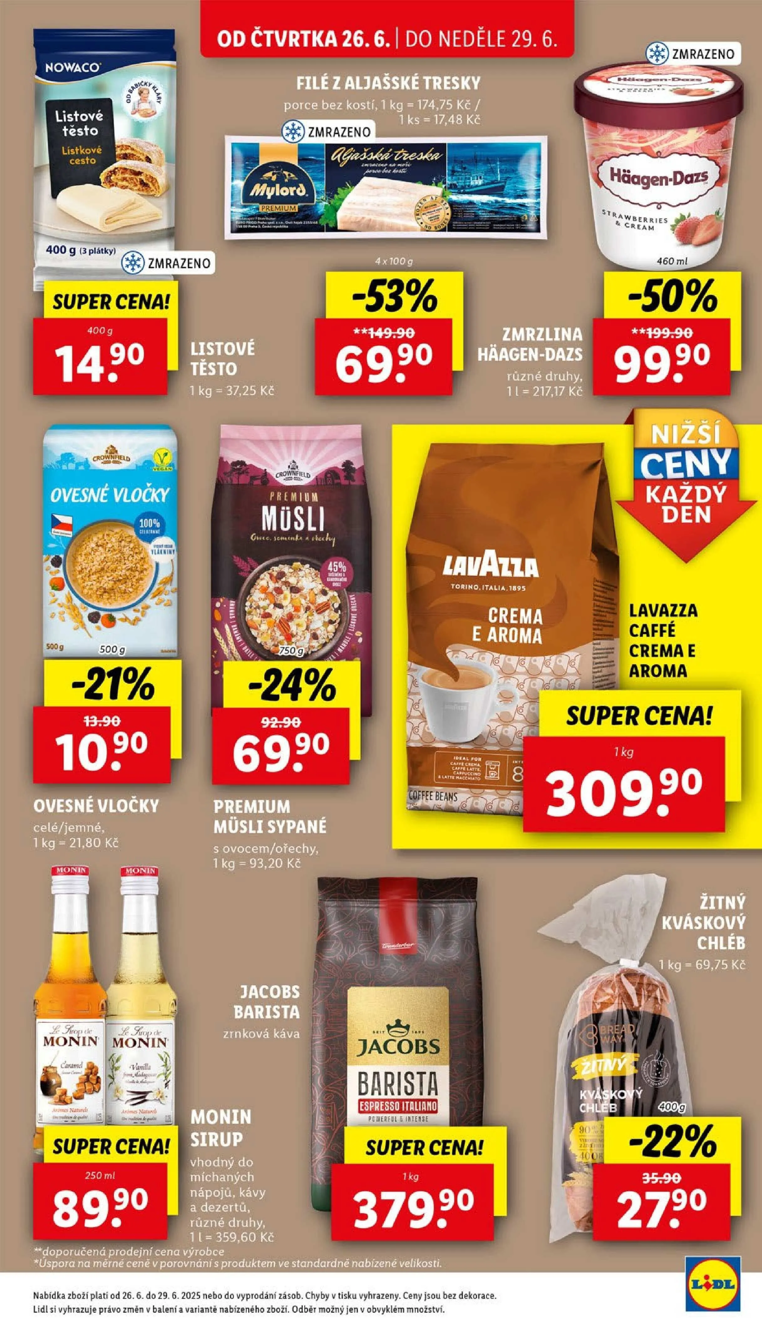 V letáku obchodu Lidl najdete skvělé nabídky, které potěší každého zákazníka. Od čtvrtka 26.6. do neděle 29.6. můžete zakoupit filé z aljašské tresky za skvělou cenu 174,75 Kč za 1 kg. Dále jsou v nabídce ovesné vločky 500 g za 10,90 Kč, což je úspora 21%. Pro milovníky müsli je připraveno premium müsli s ovocem a ořechy za 69,00 Kč, což představuje slevu 24%.