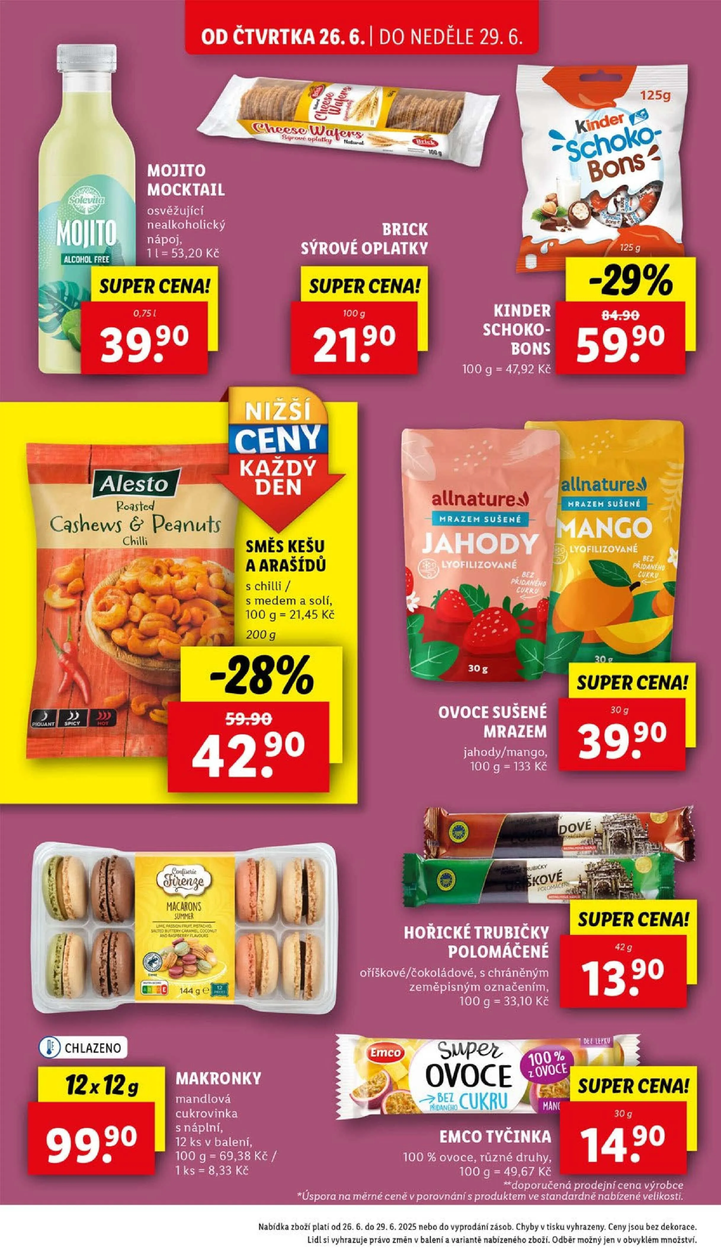 Od čtvrtka 26. 6. do neděle 29. 6. si nenechte ujít skvělé nabídky v Lidlu! Osvěžující nealkoholický nápoj mojito za super cenu 53,20 Kč. Dále nabízíme sýrové oplatky Alesto a Kinder Schoko-Bons, které potěší každého milovníka sladkostí. Mrazem sušené ovoce, jako jsou jahody a mango, je ideální volbou pro zdravé mlsání. Nezapomeňte také na hořické trubičky a mandlové makronky, které jsou skvělým dezertem. Všechny produkty jsou k dispozici za výhodné ceny, tak neváhejte a navštivte nás!
