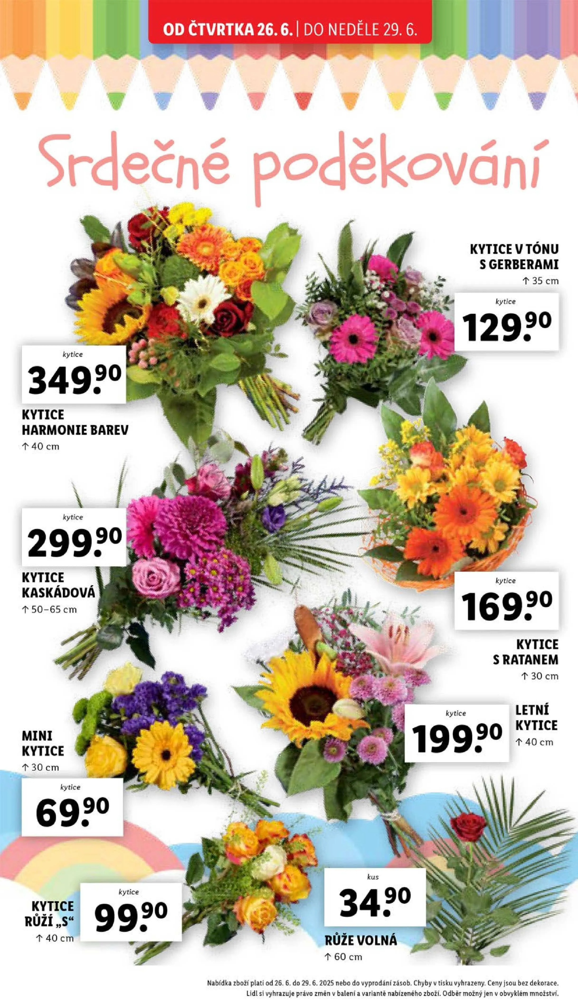 Od čtvrtka 26.6. do neděle 29.6. vám Lidl přináší širokou nabídku kytic, které potěší každého milovníka květin. Vybírat můžete z různých variant, jako jsou kytice s gerberami, kaskádové kytice nebo letní kytice růží. Kytice jsou dostupné v různých velikostech, od mini kytic o délce 30 cm až po kytice s délkou 60 cm. Nezapomeňte, že nabídka platí do vyprodání zásob. Ceny jsou uvedeny bez dekorace a Lidl si vyhrazuje právo na změny v balení a variantách nabízeného zboží. Těšíme se na vaši návštěvu!