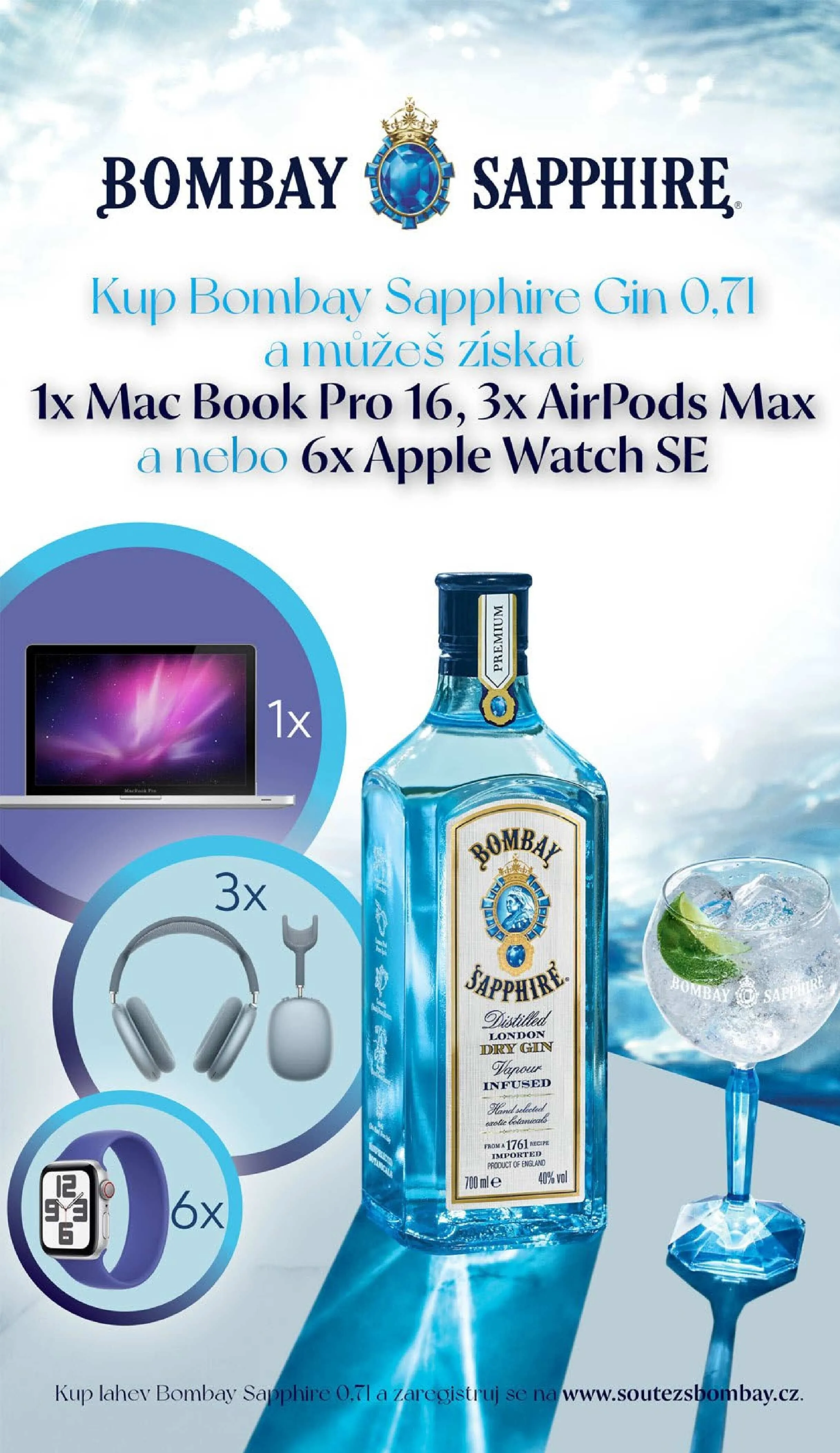 V letáku obchodu Lidl najdete skvělou nabídku na gin Bombay Sapphire 0,7 l. Při zakoupení lahve máte možnost vyhrát atraktivní ceny, jako je 1x MacBook Pro, 3x AirPods Max nebo 6x Apple Watch SE. Navíc můžete získat také London Dry Gin Infused. Nezapomeňte se zaregistrovat na www.soutezs01bay.cz a zúčastnit se soutěže!