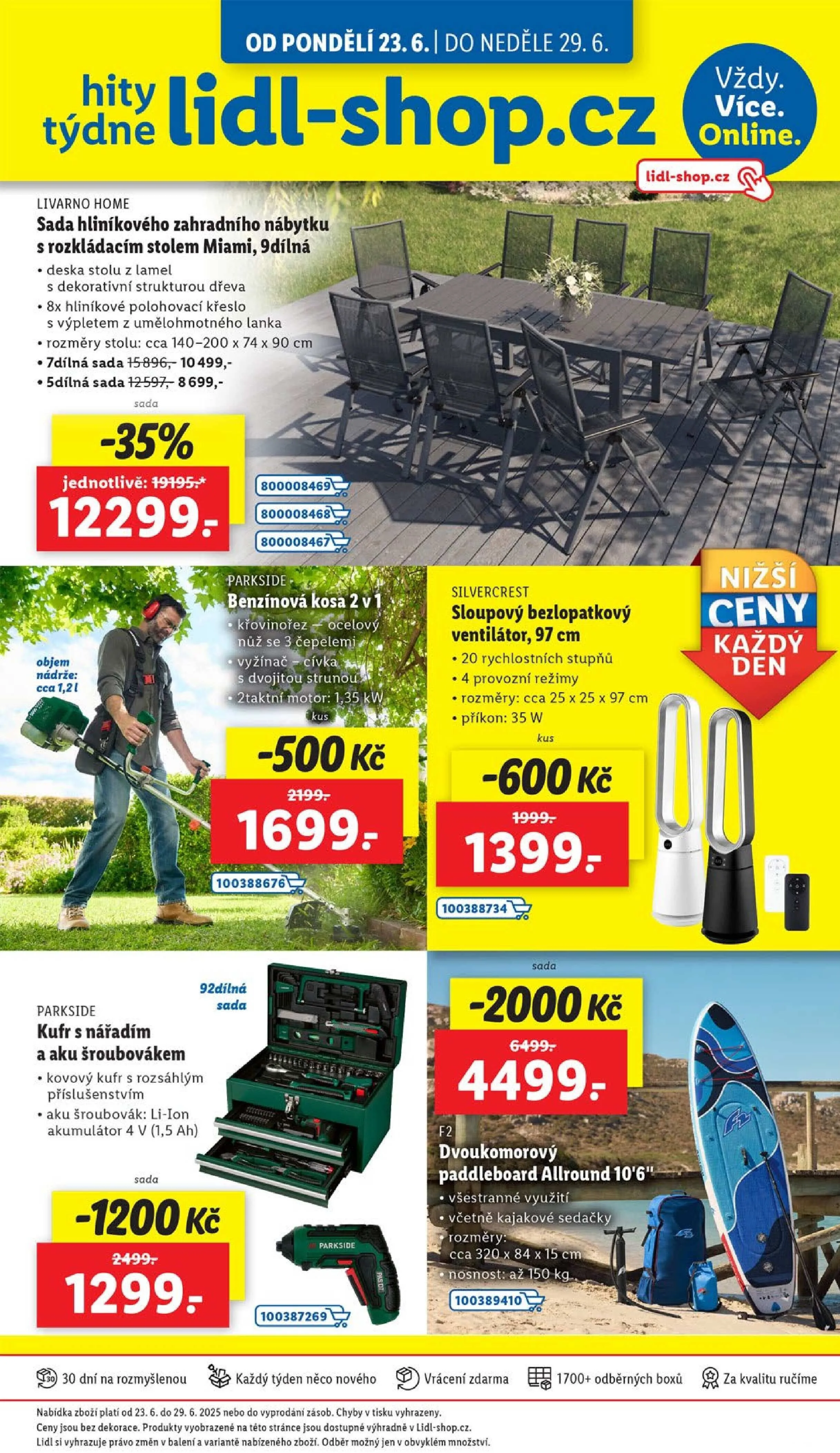Od pondělí 23. 6. do neděle 29. 6. máte možnost zakoupit skvělé produkty v obchodu Lidl. Mezi hity týdne patří 9dílná sada hliníkového zahradního nábytku s rozkládacím stolem Miami, která zahrnuje 8 polohovacích křesel a stůl s dekorativní strukturou dřeva. Cena této sady je 10 499 Kč, což představuje slevu 35 %.