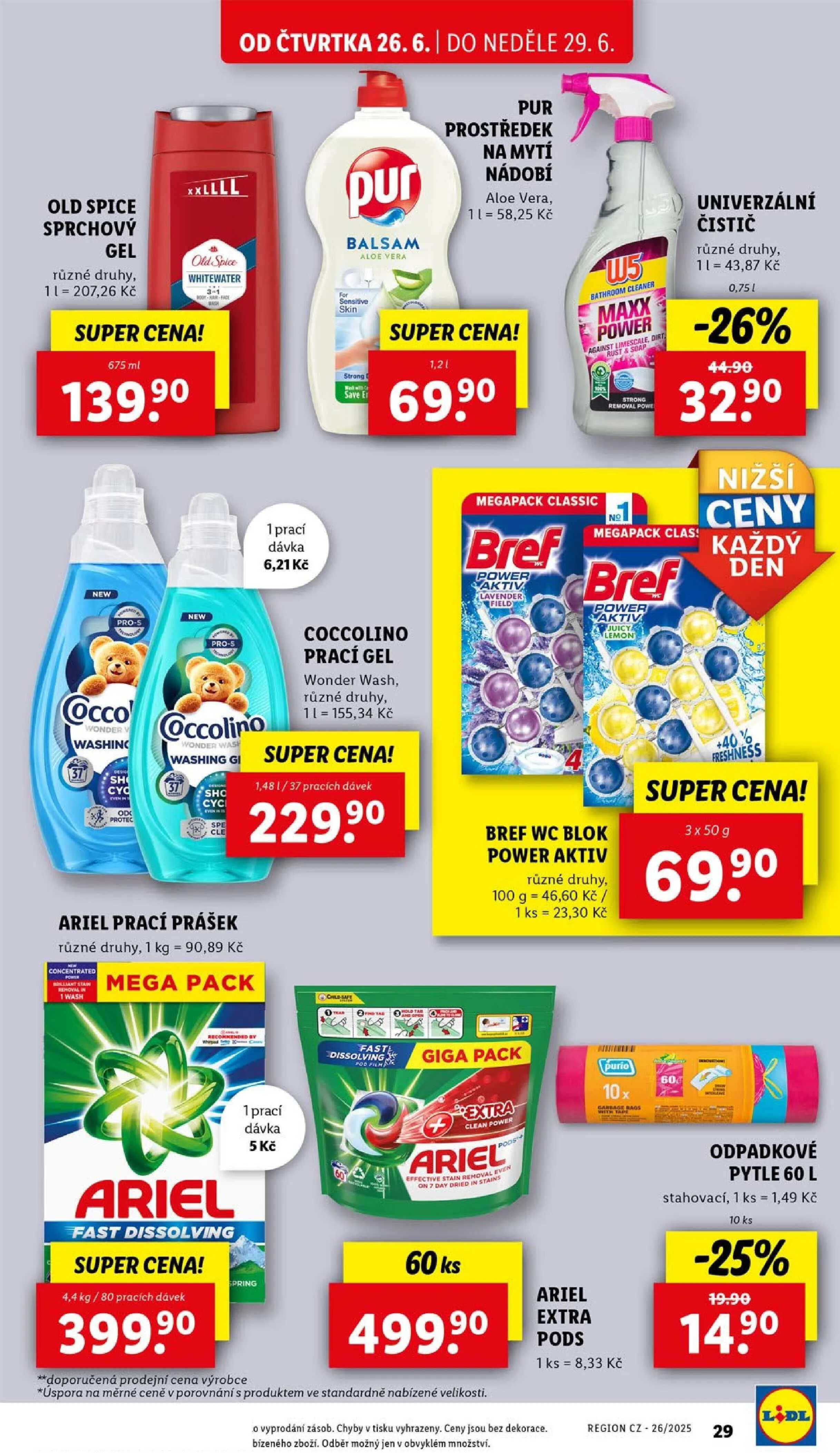 V letáku obchodu Lidl najdete skvělé nabídky na různé produkty! Od čtvrtka 26.6. do neděle 29.6. si můžete pořídit sprchový gel Old Spice za super cenu 139,90 Kč. Dále nabízíme prostředek na mytí nádobí Pur s aloe vera za 58,25 Kč. Nezapomeňte také na prací gel Coccolino Wonder Wash, který je k dostání v různých druzích za 155,34 Kč.