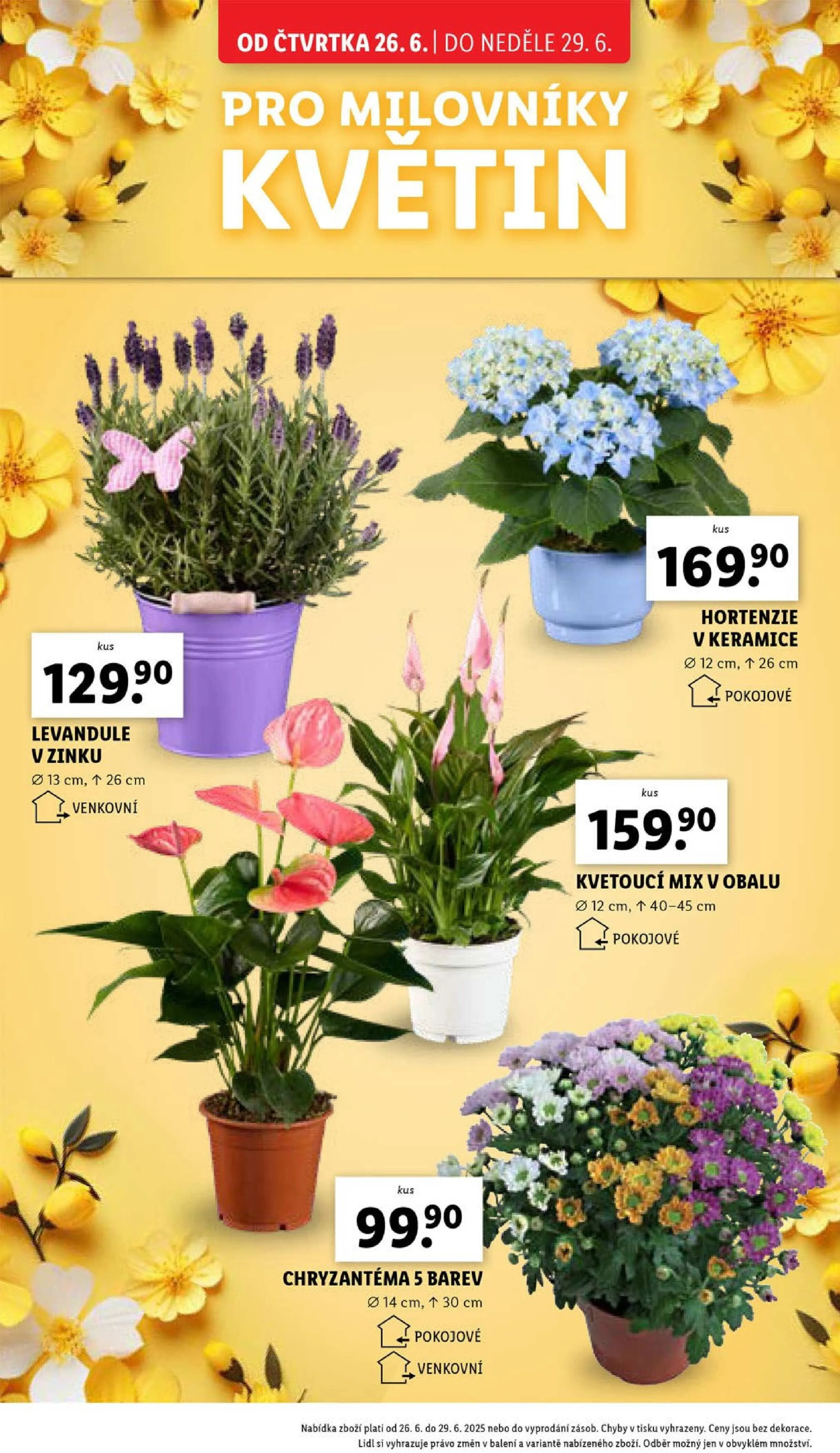 V letáku obchodu Lidl najdete skvělou nabídku rostlin pro milovníky květin. Od čtvrtka 26.6. do neděle 29.6. si můžete pořídit levanduli v zinku o výšce 13 cm a 26 cm, ideální pro venkovní prostory. Dále nabízíme hortenzie v keramice o velikosti 12 cm a 26 cm, které skvěle ozdobí váš interiér. Pro pokojové rostliny si můžete vybrat kvetoucí mix v obalu o výšce 12 cm a 40-45 cm. Nezapomeňte také na chryzantémy v pěti barevných variantách, které jsou dostupné v pokojové i venkovní variantě o velikosti 14 cm a 30 cm. Nabídka platí do vyprodání zásob. Ceny jsou uvedeny bez dekorace.