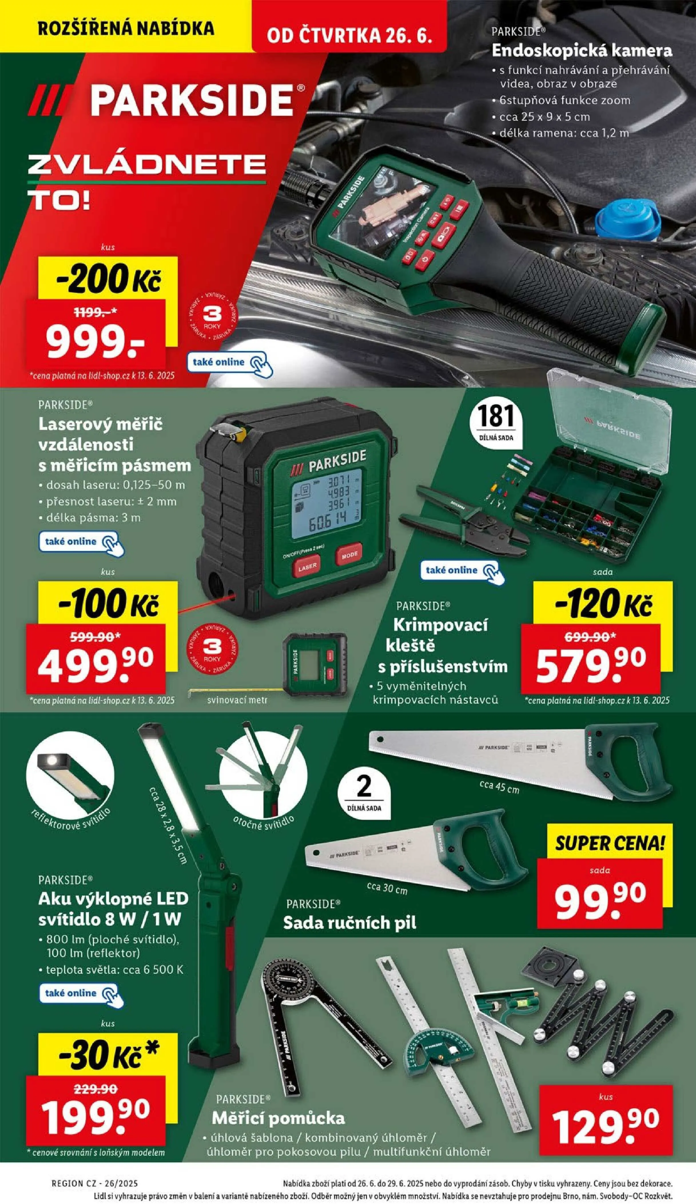V letáku obchodu Lidl najdete rozšířenou nabídku produktů značky Parkside, která platí od čtvrtka 26. června. Mezi zajímavé položky patří endoskopická kamera s funkcí nahrávání a přehrávání videa, laserový měřič vzdálenosti s přesností ± 2 mm a aku výklopné LED svítidlo. Dále si můžete pořídit krimpovací kleště s vyměnitelnými nástavci a multifunkční úhloměr. Ceny jsou zvýhodněné, například laserový měřič je k dostání za 499 Kč a LED svítidlo za 199 Kč. Nabídka platí do 29. června 2025 nebo do vyprodání zásob. Nezapomeňte, že ceny jsou bez dekorace a Lidl si vyhrazuje právo na změny v balení a variantách nabízeného zboží.