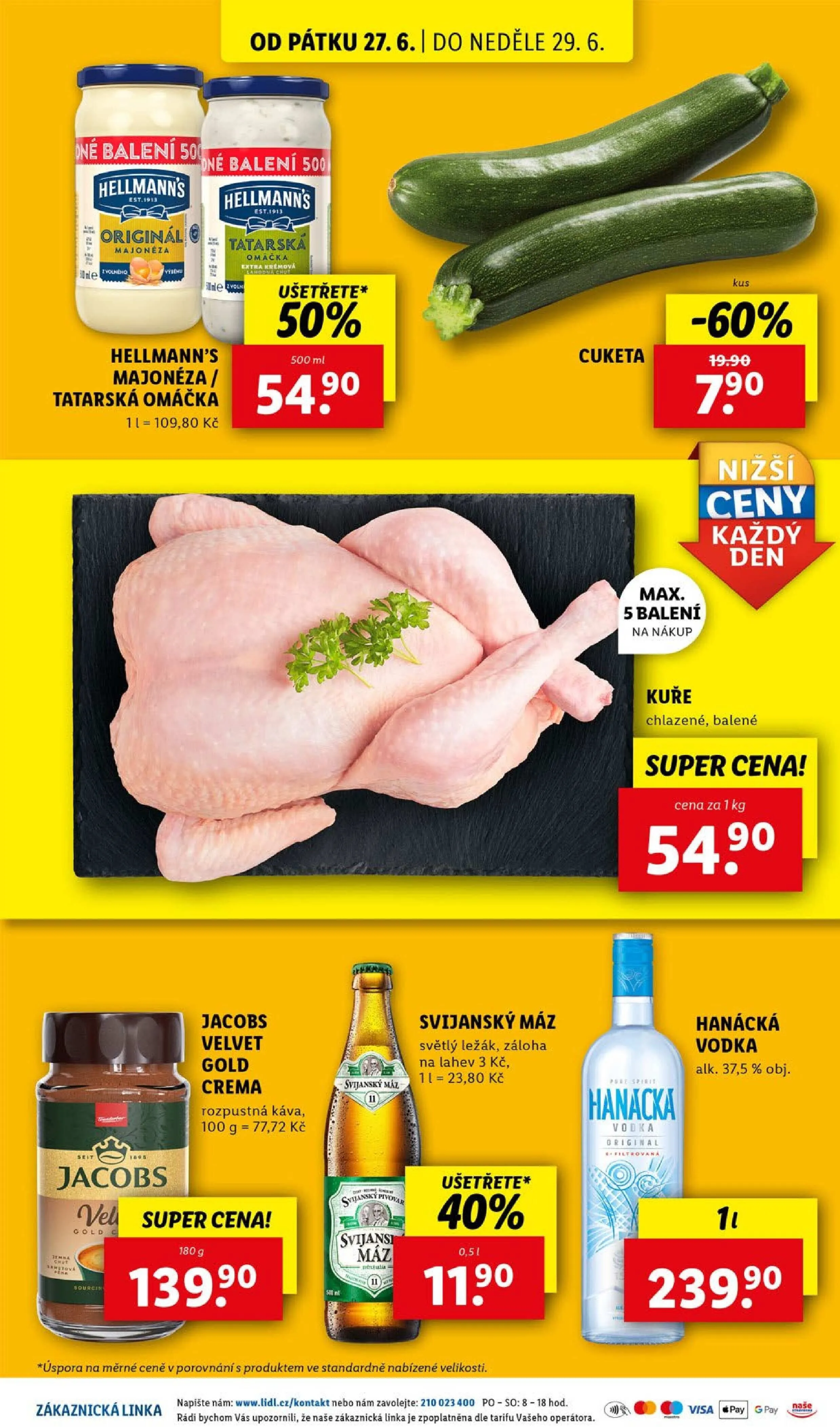 Od pátku 27.6. do neděle 29.6. si nenechte ujít skvělé nabídky v Lidlu! V letáku najdete majonézu Hellmann's a tatarskou omáčku za skvělou cenu 109,80 Kč za balení 500 g. Ušetřete 60 % na cuketě, která je nyní k dostání za pouhých 79 Kč.