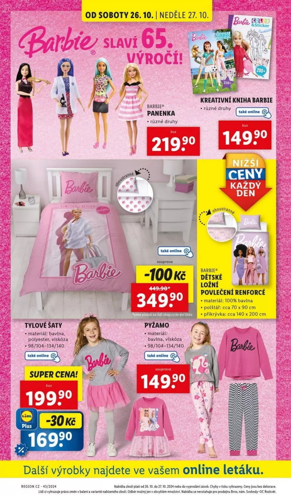 Od soboty 26.10. do neděle 27.10. si můžete v Lidlu pořídit skvělé produkty k příležitosti výročí! Nabízíme tylové šaty vyrobené z bavlny, polyesteru a viskózy v velikostech 98/104-134/140 za super cenu. Dále máme různé druhy Barbie panenek a kreativní knihy Barbie, které potěší každého malého fanouška.