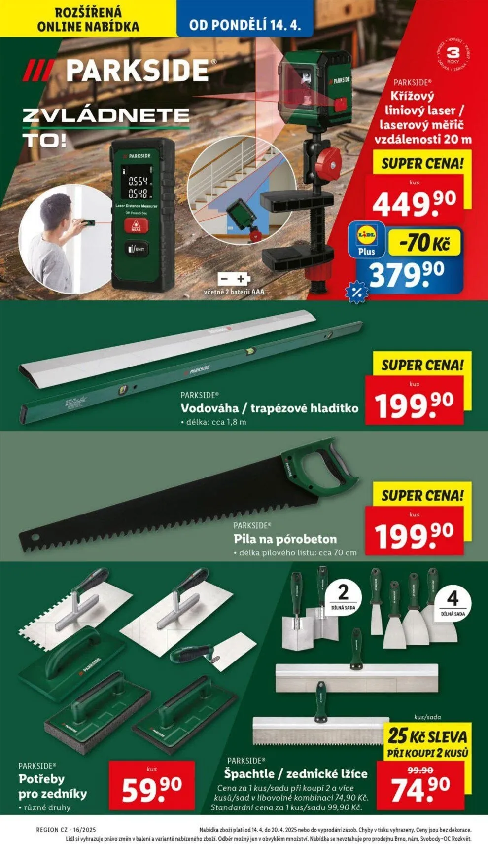 V letáku obchodu Lidl najdete rozšířenou online nabídku, která platí od pondělí 14.4. Mezi zajímavé produkty patří křížový a liniový laser, laserový měřič vzdálenosti do 20 m za super cenu 449 Kč. Dále je v nabídce vodováha a trapézové hladítko s délkou cca 1,8 m za 59 Kč. Pro zedníky jsou připraveny různé potřeby, včetně pily na pórobeton s délkou pilového listu cca 70 cm. Špachtle a zednické lžíce jsou k dispozici za cenu 74,90 Kč při koupi 2 a více kusů, standardní cena je 99,90 Kč. Nabídka platí do 20.4.2025 nebo do vyprodání zásob. Ceny jsou bez dekorace a Lidl si vyhrazuje právo na změny v balení.