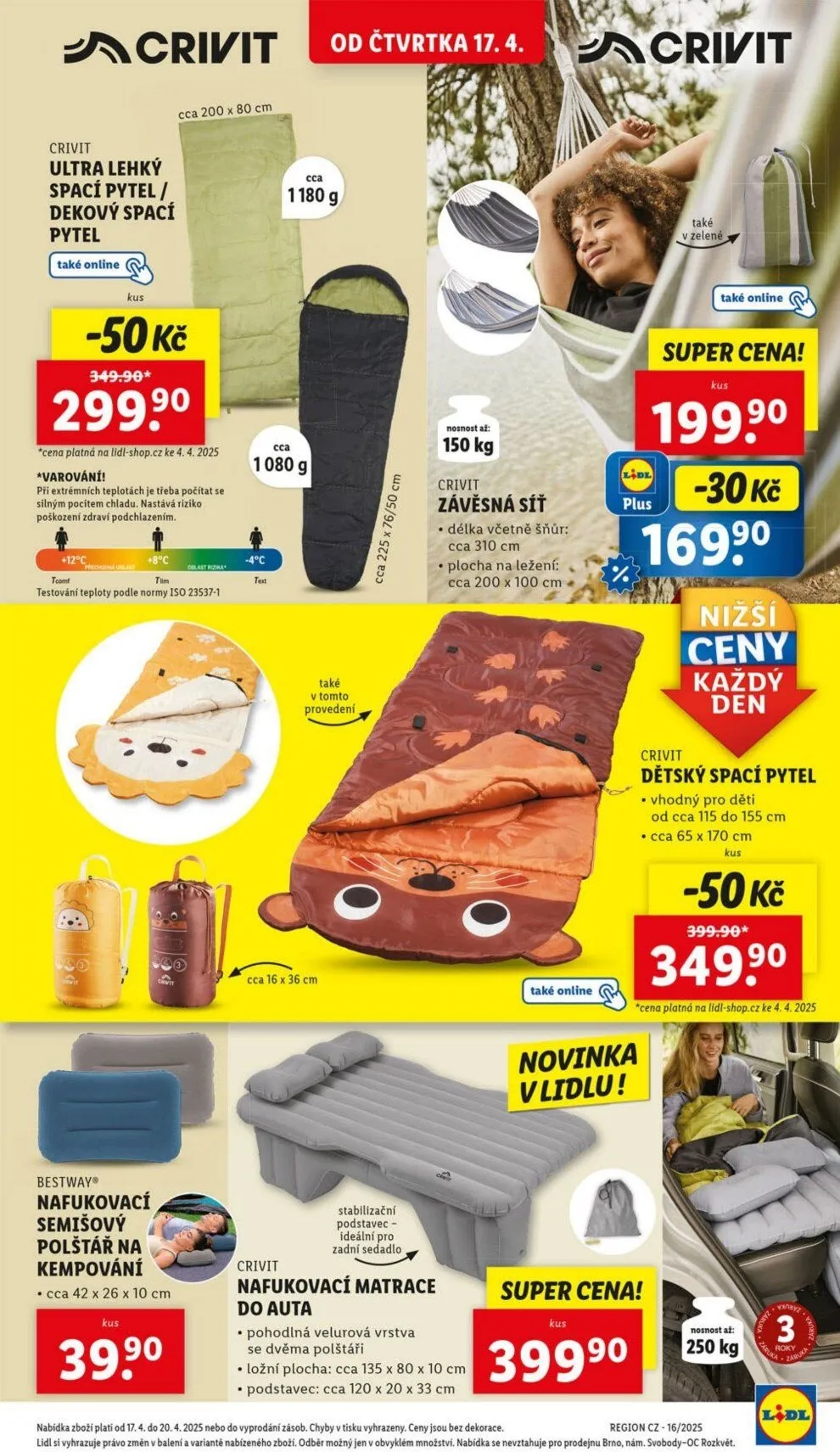 V letáku obchodu Lidl najdete skvělou nabídku produktů pro kempování a volný čas. Od čtvrtka 17.4. si můžete pořídit ultra lehký spací pytel Crivit za cenu 299 Kč, který je ideální pro outdoorové aktivity. Dále je k dispozici nafukovací semišový polštář Bestway, který má rozměry cca 42 x 26 x 10 cm a stojí 390 Kč. Pro děti je připraven dětský spací pytel Crivit, vhodný pro výšku od 115 do 155 cm, za cenu 349 Kč.