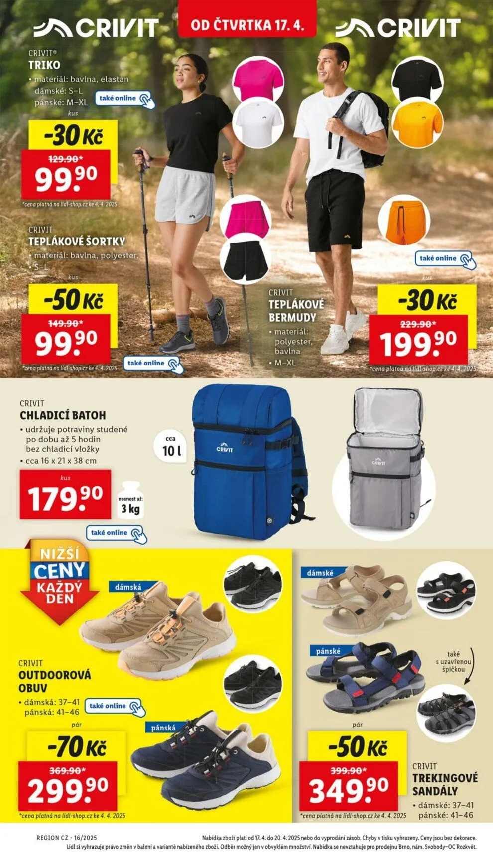 V letáku obchodu Lidl najdete širokou nabídku produktů značky Crivit. Mezi nimi jsou dámská a pánská trika vyrobená z bavlny a elastanu, dostupná ve velikostech S-L a M-XL. Dále si můžete pořídit teplákové šortky a bermudy, které jsou vyrobeny z bavlny a polyesteru, a to za zvýhodněné ceny.