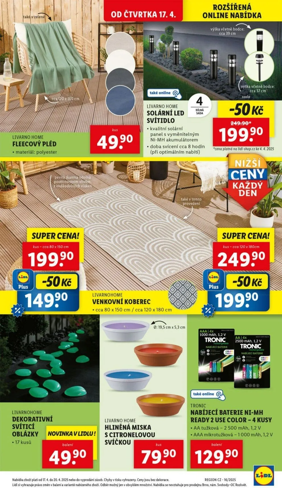 V letáku obchodu Lidl najdete skvělé produkty pro váš domov a zahradu. Mezi novinkami se objevuje fleecový pléd značky Livarno Home, vyrobený z polyesteru, o rozměrech cca 80 x 150 cm, nyní za super cenu 199 Kč. Dále nabízíme dekorativní solární LED svítidlo, které má výšku 39 cm a svítí až 8 hodin po optimálním nabití, za cenu 499 Kč.