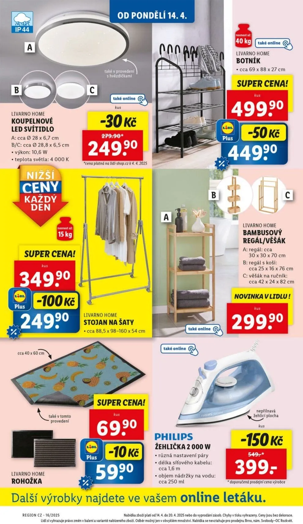 Pro milovníky praktických doplňků je tu rohožka Livarno Home za 69 Kč a botník s rozměry 69 x 88 x 27 cm za 499 Kč. Nezapomeňte také na žehličku Philips s různými nastaveními páry, která je k dostání za 449 Kč.