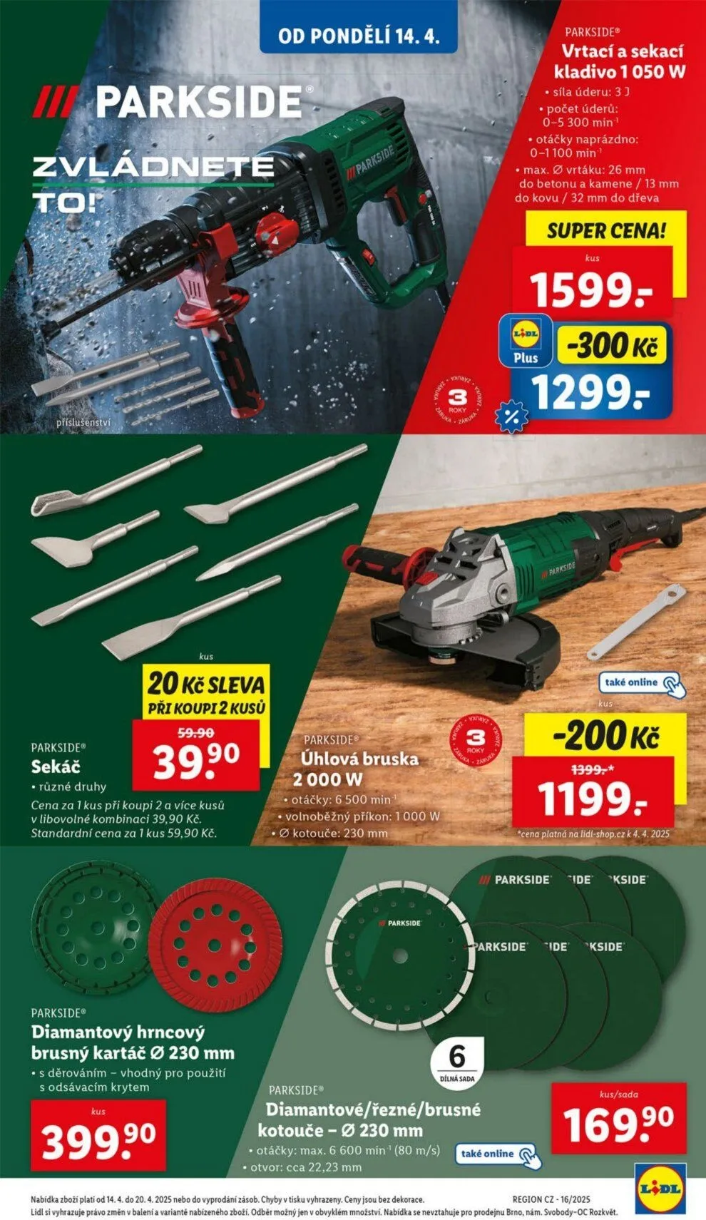 Od pondělí 14.4. v Lidlu najdete skvělé akční nabídky! Mezi nimi je úhlová bruska Parkside s výkonem 1 050 W a sílou úderu 3 J za super cenu 1 299 Kč, což je sleva 300 Kč. Dále nabízíme vrtací a sekací kladivo Parkside, které zvládne vrtání do betonu až do průměru 26 mm.