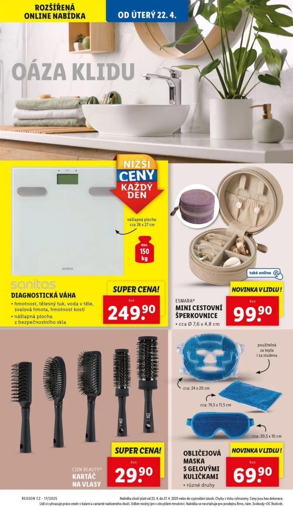 Od úterý 22. dubna si v Lidlu můžete vybrat z široké nabídky produktů. Mezi novinkami najdete diagnostickou váhu značky Sanitas, která měří hmotnost, tělesný tuk, vodu v těle, svalovou hmotu a hmotnost kostí. Je vybavena nášlapnou plochou z bezpečnostního skla.