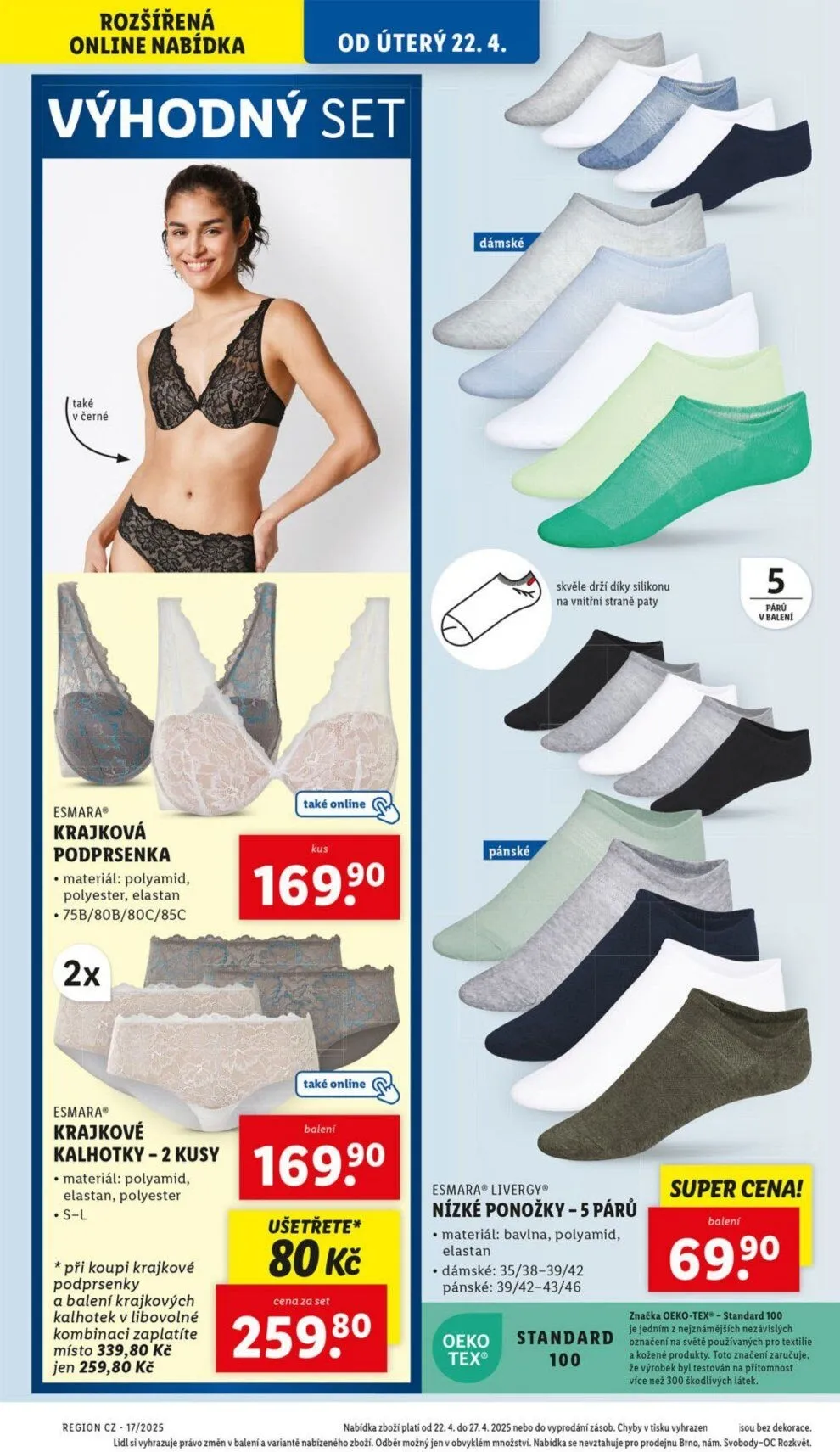 Od úterý 22.4. si můžete v Lidlu pořídit výhodný set dámské krajkové podprsenky a kalhotek. Podprsenka je vyrobena z polyamidu, polyesteru a elastanu a je dostupná ve velikostech 75b, 80b, 80c a 85c. K ní si můžete zakoupit krajkové kalhotky ve dvou kusech, které jsou také vyrobeny z kvalitních materiálů. Při koupi obou produktů v libovolné kombinaci zaplatíte místo 339,80 Kč jen 259,80 Kč, což znamená úsporu 80 Kč.