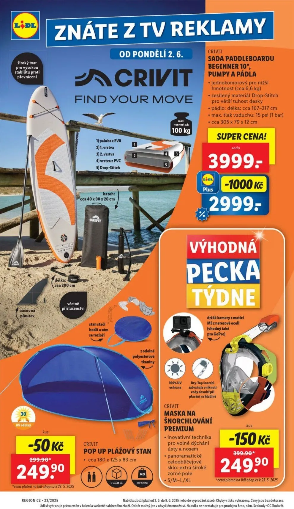 V letáku obchodu Lidl najdete skvělou nabídku produktů pro letní radovánky. Od pondělí 2. června si můžete pořídit sadu paddleboardu Crivit, která zahrnuje vše potřebné pro začátečníky, včetně pumpy a pádla. Paddleboard má široký tvar pro stabilitu a je vyroben z odolného materiálu drop-stitch. Jeho hmotnost je cca 6,6 kg a maximální tlak vzduchu dosahuje 15 psi.