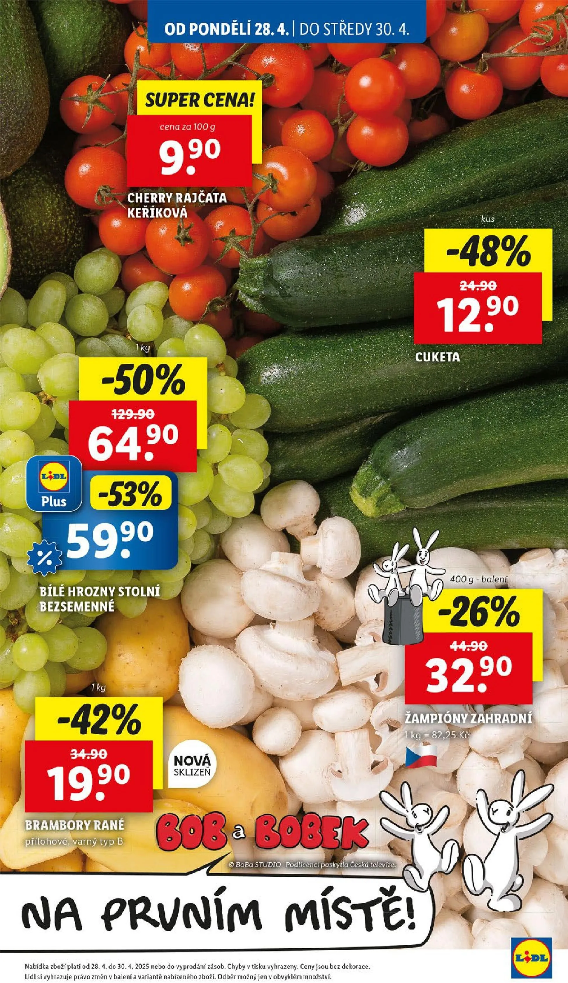 Od pondělí 28.4. do středy 30.4. máte možnost využít super ceny v obchodě Lidl! V letáku najdete skvělé nabídky, jako jsou cherry rajčata keříková se slevou -50%, bílé hrozny stolní bezsemenné se slevou -42%, a rané brambory se slevou -48%. Také si můžete pořídit cuketu v balení 400 g se slevou -26% a žampiony za skvělou cenu. Nezapomeňte, že nabídka platí do vyprodání zásob. Těšíme se na vaši návštěvu!