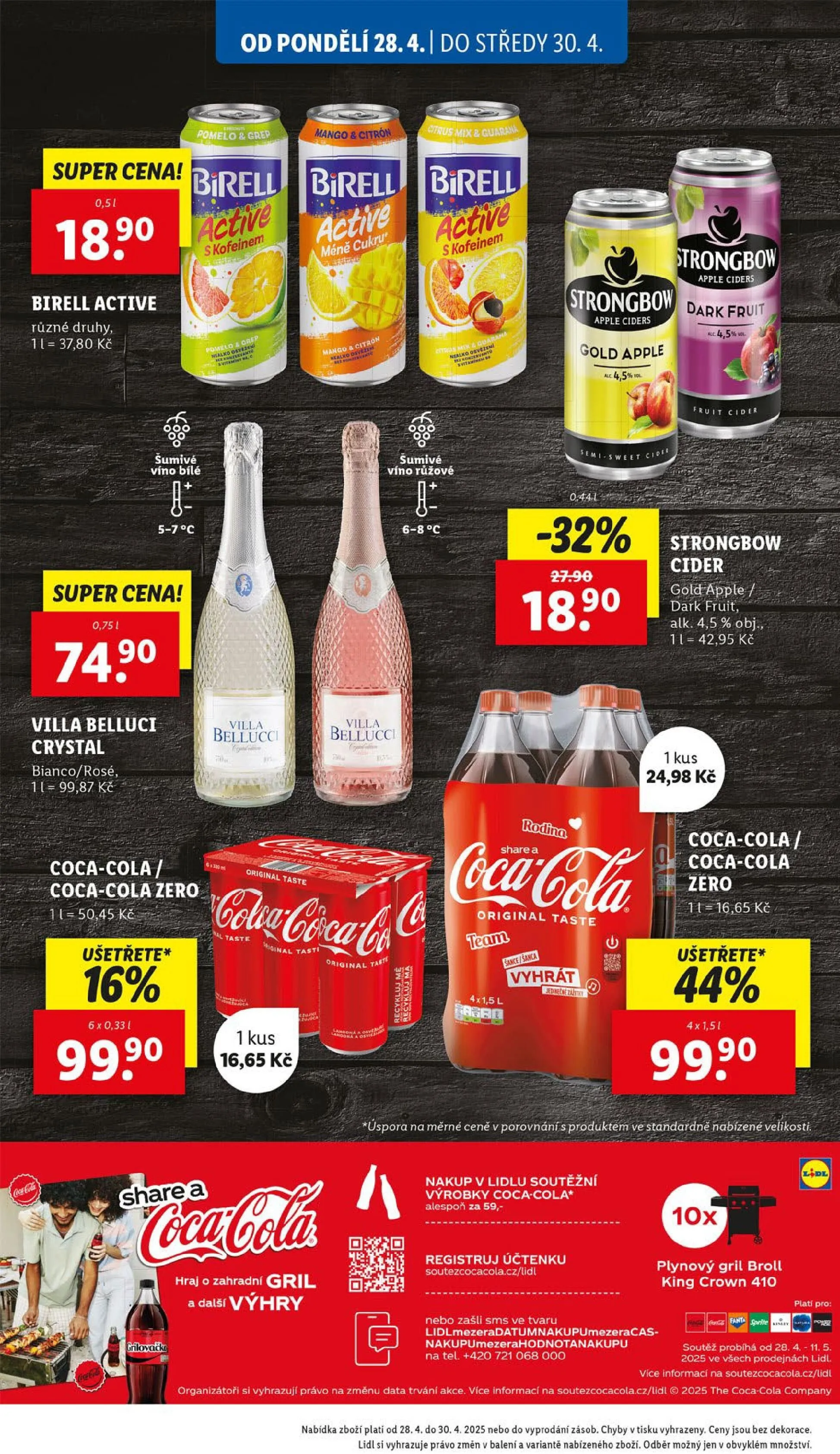 Od pondělí 28.4. do středy 30.4. si nenechte ujít skvělé nabídky v Lidlu! V letáku najdete různé druhy Birellu, včetně variant s kofeinem a bez cukru, za super cenu od 11 do 37,80 Kč. Dále nabízíme víno Villa Bellucci Crystal Bianco/Rosé za 99,87 Kč a osvěžující Coca-Colu a Coca-Colu Zero za 16,65 Kč. Nezapomeňte také na cider Strongbow Dark Fruit za 42,95 Kč. A navíc, hrajte o zahradní gril a další skvělé výhry! Ušetřete až 44% na vybraných produktech. Těšíme se na vaši návštěvu!