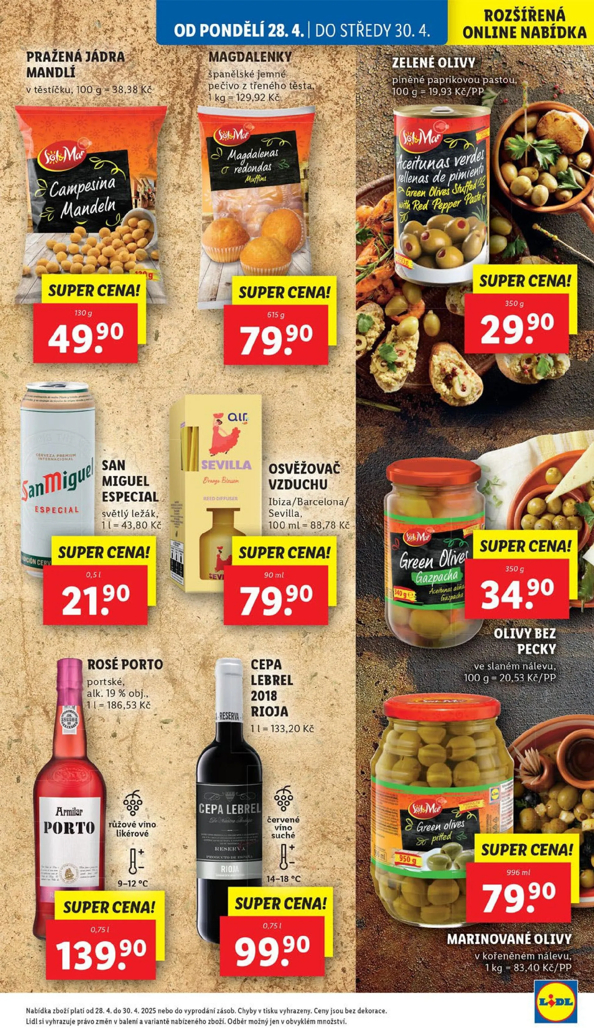 V letáku obchodu Lidl na období od 28.4. do 30.4. najdete skvělé nabídky na různé produkty. Mezi nimi se objevují lahodné magdalenky a pražené mandle za super cenu 49,90 Kč. Dále si můžete vychutnat světlý ležák Miguel Especial za 43,80 Kč a jemné portské víno Rosé Porto s obsahem alkoholu 19 % za 21,90 Kč.