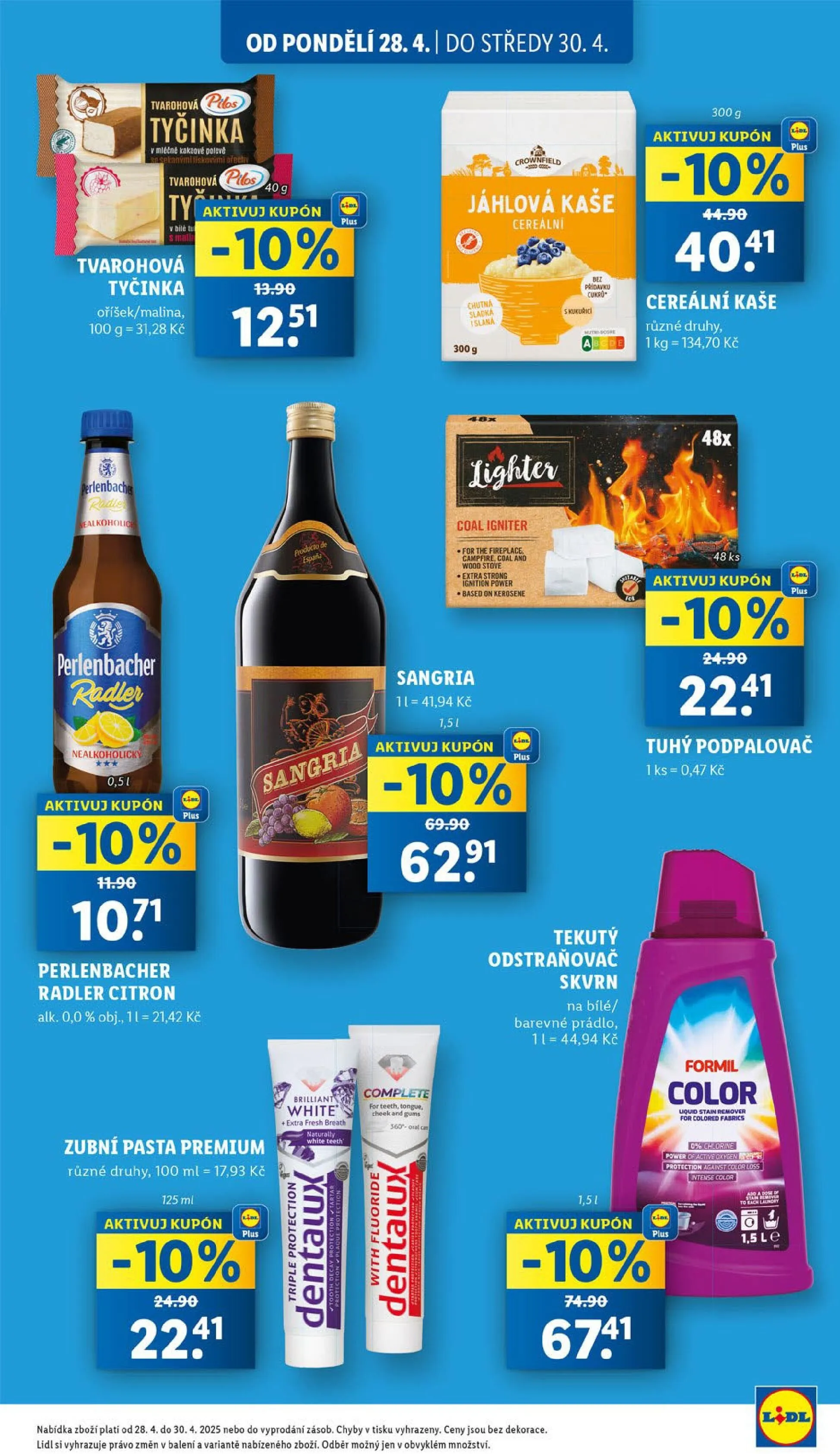 Od pondělí 28.4. do středy 30.4. si můžete v Lidlu zakoupit širokou škálu produktů. Mezi nimi najdete tvarohové tyčinky s příchutí oříšek/malina za 31,28 Kč, jáhlovou kaši a cereální kaše různých druhů za 134,70 Kč za 1 kg. Nezapomeňte také na nealkoholický Perlenbacher za 21,42 Kč a radler citron. Pro údržbu prádla je k dispozici tekutý odstraňovač skvrn za 44,94 Kč. V nabídce je také zubní pasta premium za 17,93 Kč za 100 ml. Všechny ceny jsou bez dekorace a platí do vyprodání zásob.